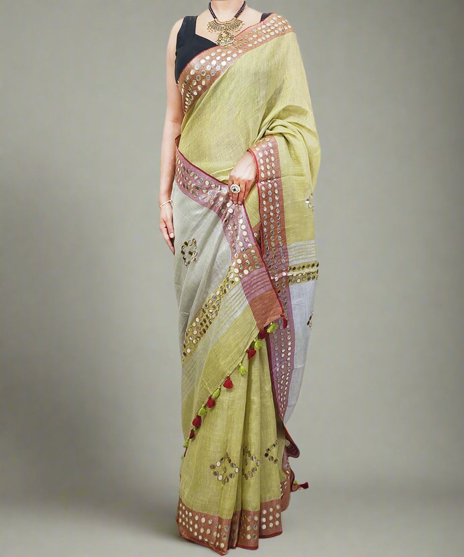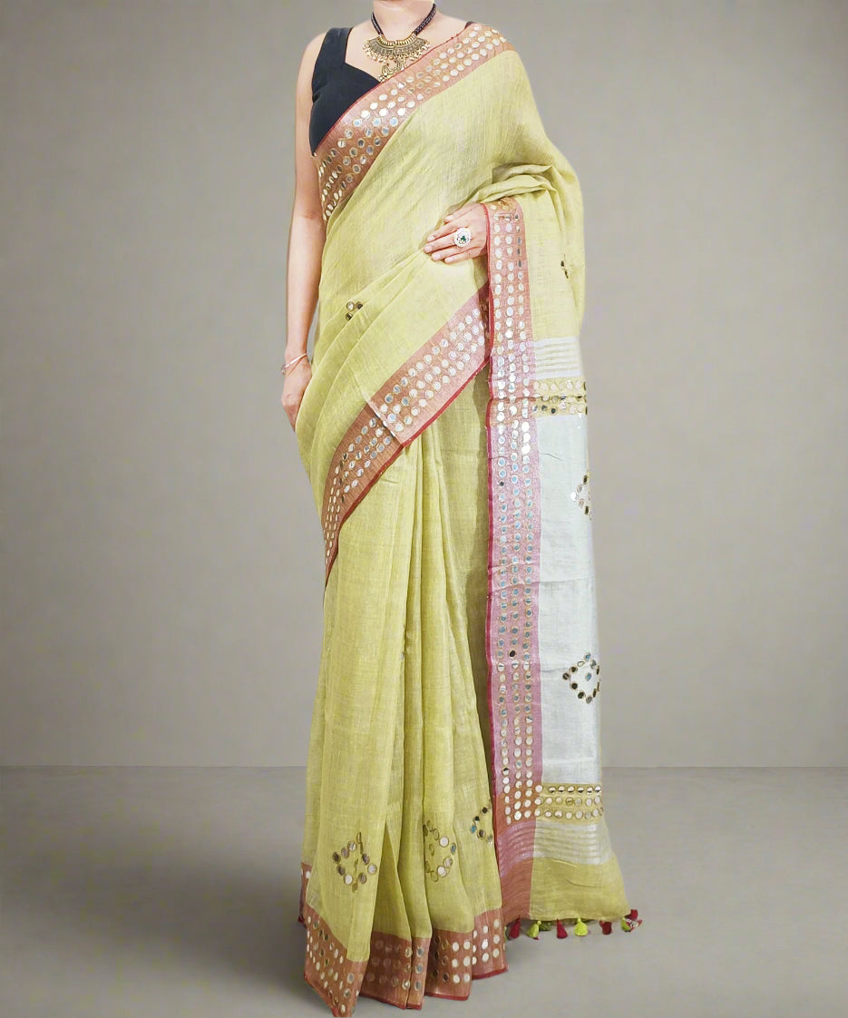 Drape this mirror embroidered corn yellow linen saree with narrow silver border around you and stand out from the crowd. Linen sarees are best for office wear. One can go with simple neat look by accessorizing it with minimal jewellery and clean hair do. Pair your sophisticated linen saree with matching or plain blouse. Make it a style statement by creative draping and contrast blouse. Because of the simplicity of a linen saree, you can be more daring with your accessories.