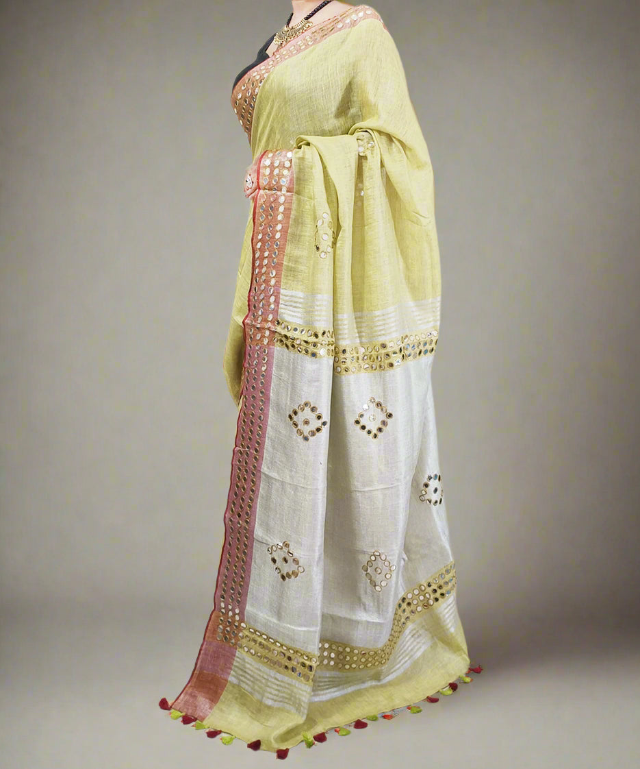 Wash & care: Gentle hand wash, Dry clean, Do not bleach. Dry in shade.Drape this mirror embroidered corn yellow linen saree with narrow silver border around you and stand out from the crowd.... Read More