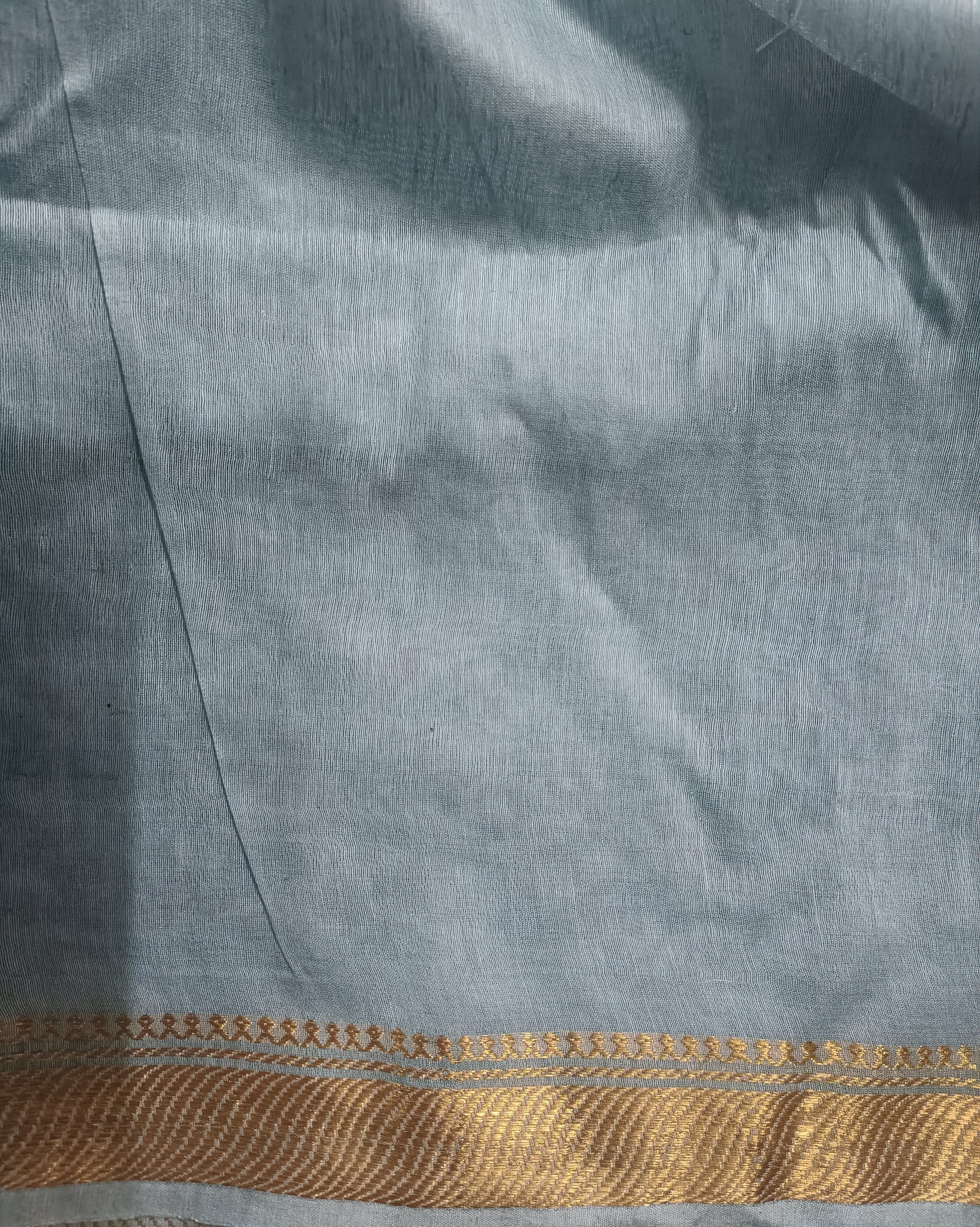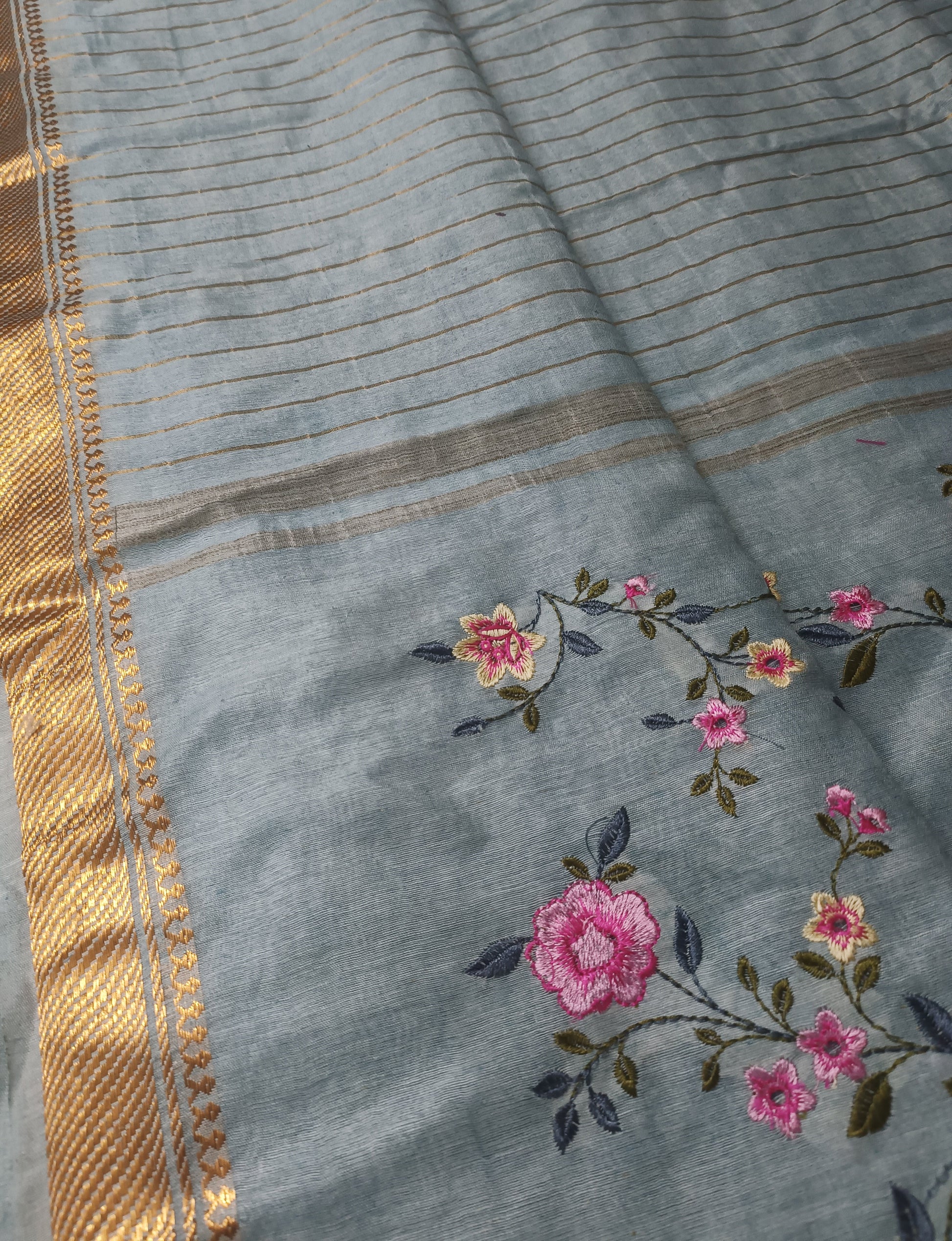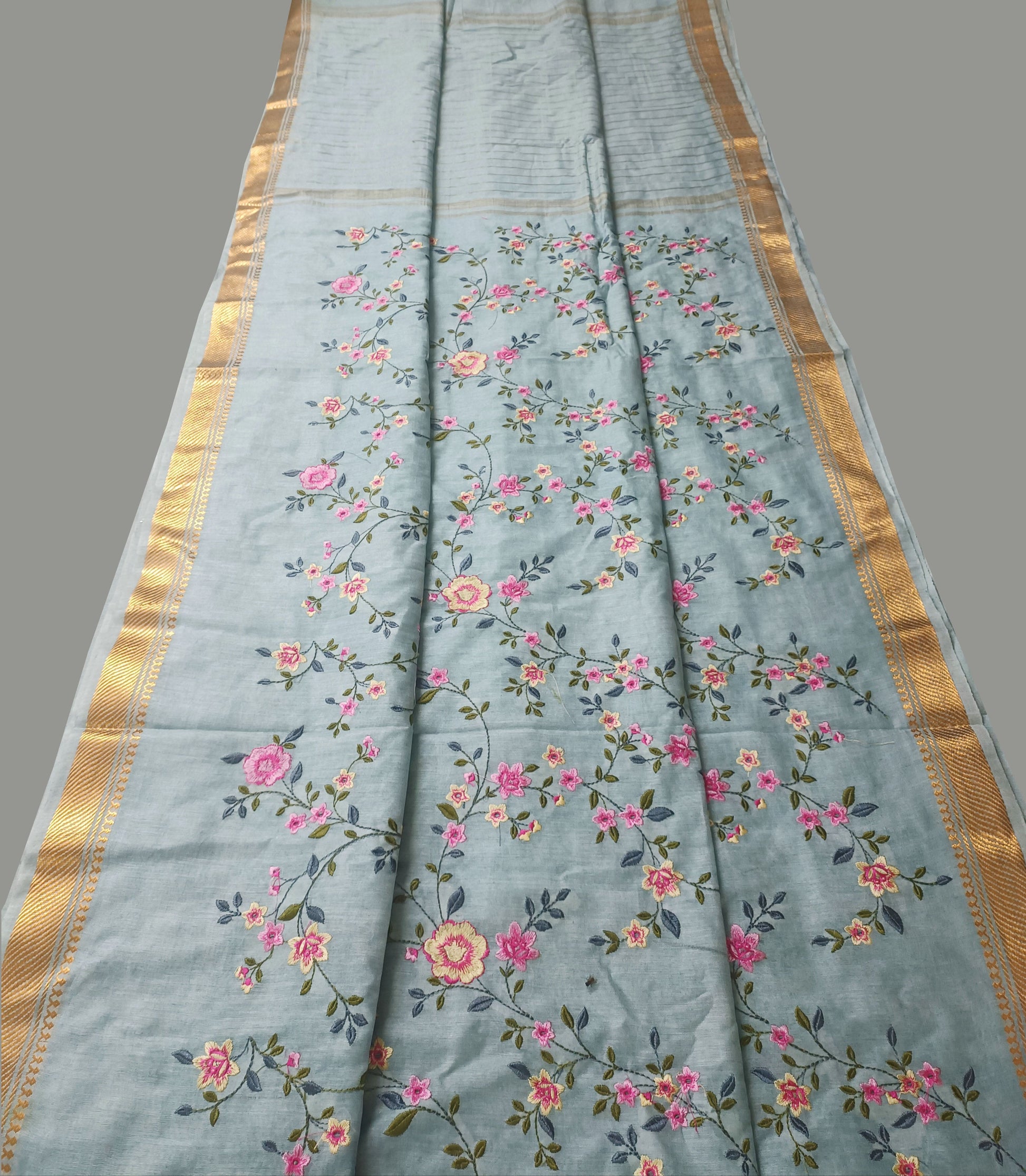 What truly sets this saree apart is its captivating embroidery. Skilled artisans have painstakingly adorned the fabric with delicate and elaborate designs, creating a visual symphony of floral motifs, paisleys, and geometric patterns. The rich threadwork, often embellished with subtle sequins and beads, adds a touch of glamour to the traditional charm of the saree.