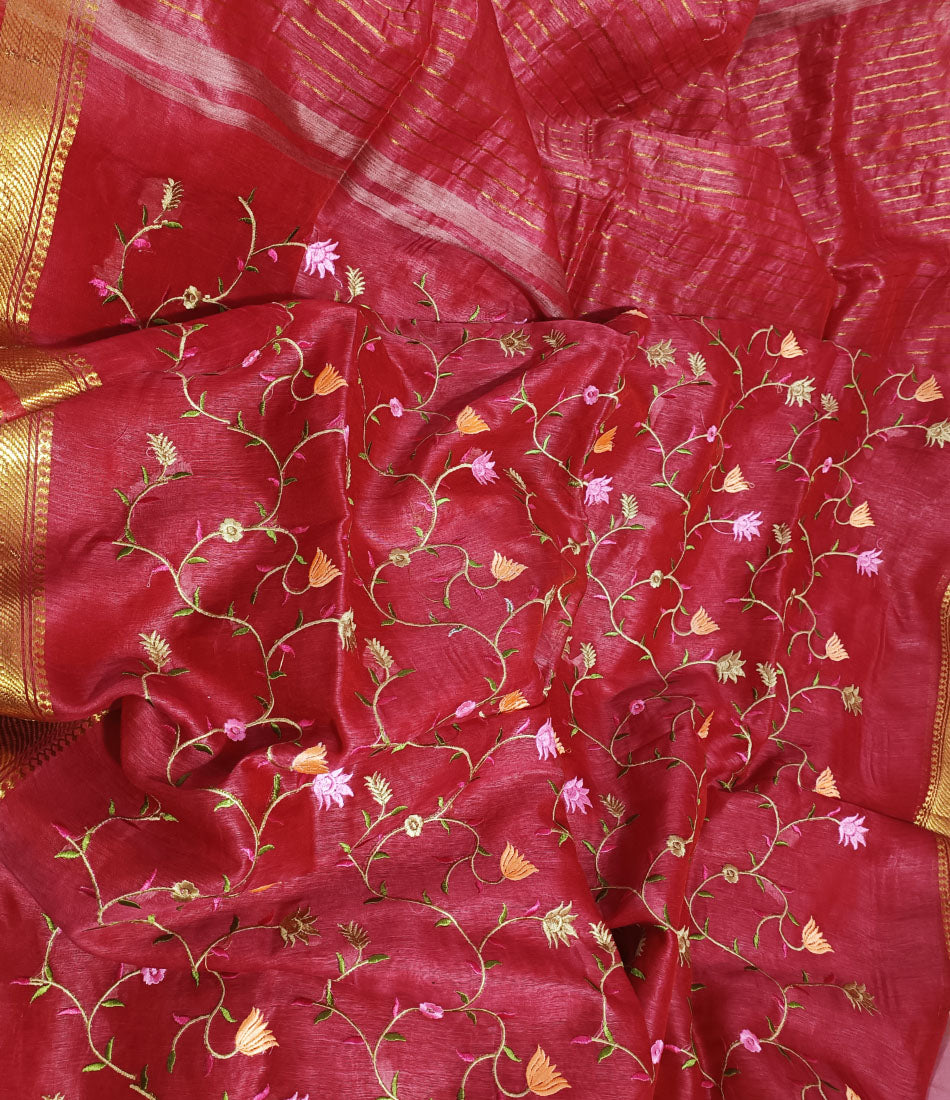 Embroidered Red Silk Linen Saree