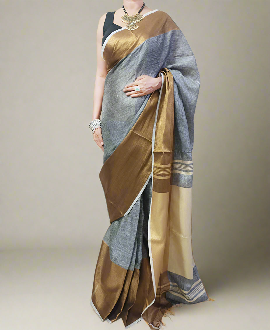 Golden Zari Border Gray Linen Saree