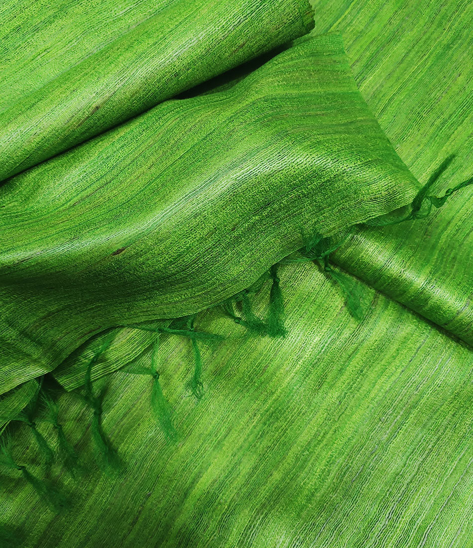 Enrich your wardrobe with elegant single dye tussar ghicha silk sarees with plain border and running blouse piece. Choose this green handloom tussar ghicha silk saree made from high quality silk yarn to complete your elegant yet classy look. An effortless style statement for your formal and party look.