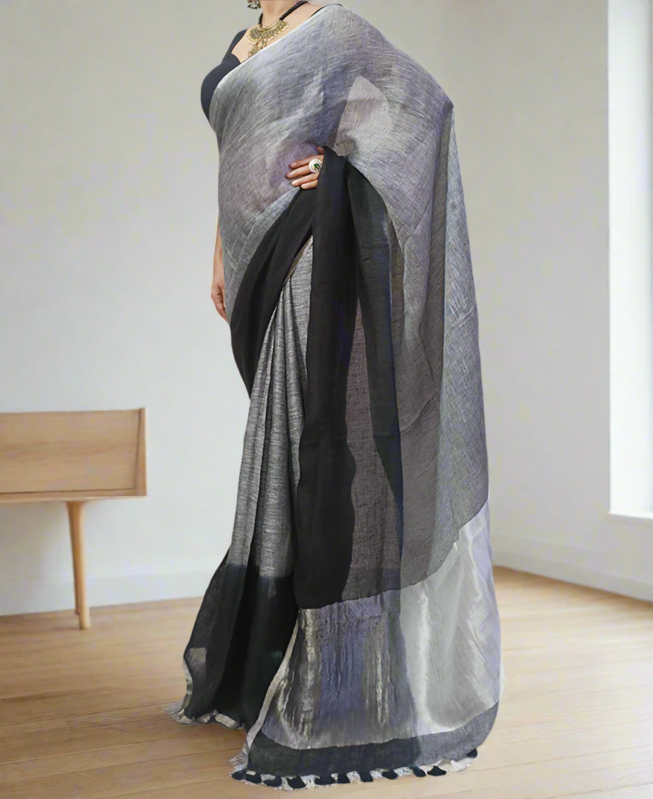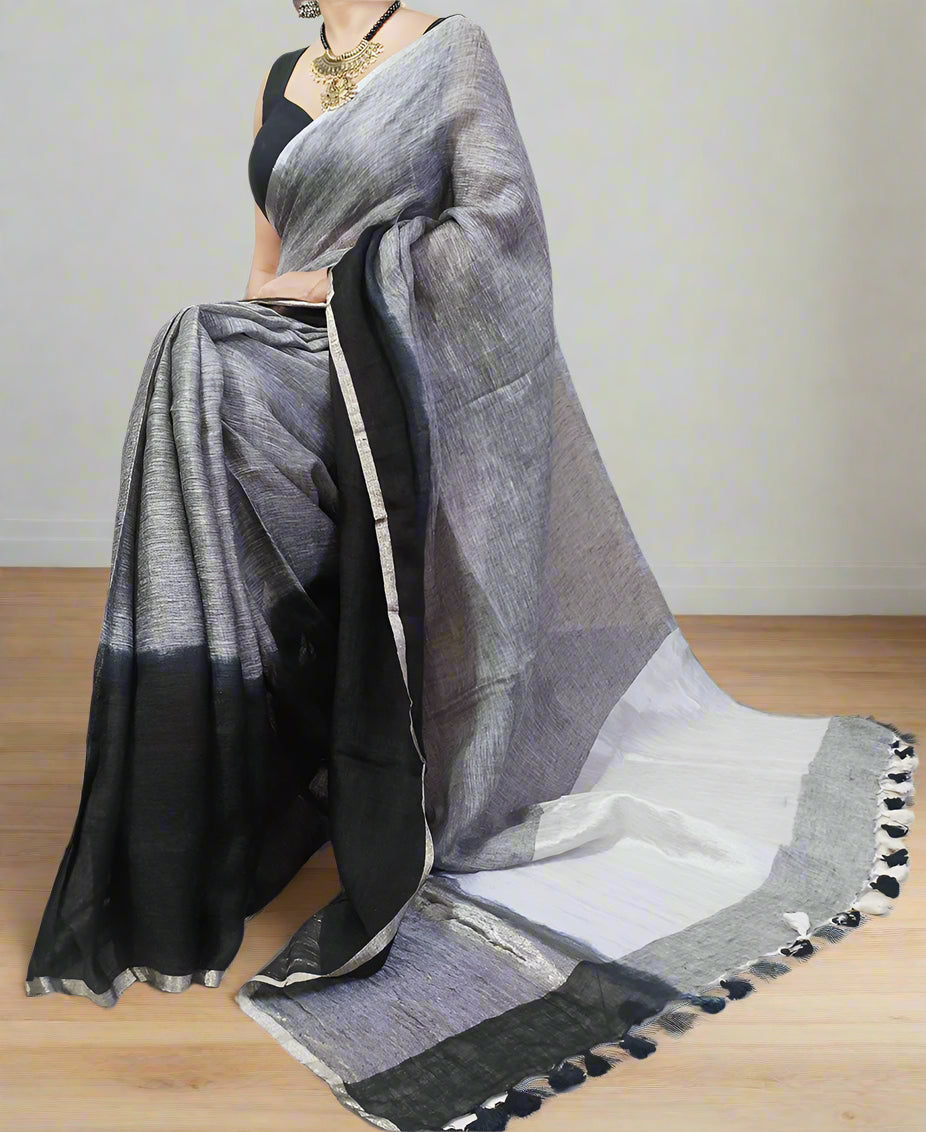 Elevate your ethnic wardrobe with our Grey and Black Linen Saree, a timeless blend of sophistication and style. Crafted from high-quality linen fabric, this saree seamlessly combines the elegance of grey with the classic allure of black, creating a mesmerizing visual appeal. The subtle sheen and soft texture of the linen add a touch of luxury, ensuring comfort throughout the day. The saree features a meticulously designed border and pallu, adorned with intricate patterns and detailing that exude grace and charm. Whether you're attending a formal event or a festive celebration, this versatile saree is a perfect choice. Pair it with a contrasting blouse for a striking effect, or opt for a monochromatic look for understated elegance. Embrace the understated beauty and versatility of the Grey and Black Linen Saree, a wardrobe essential that effortlessly combines tradition with contemporary flair.