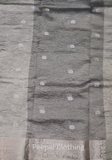 Introducing our exquisite Banarasi Crush Tissue Saree, a timeless piece that epitomizes elegance and tradition. This saree features a luxurious texture with intricate buta (floral motifs) spread throughout, adding a touch of sophistication and charm. The highlight of this saree is its ornate zari border, meticulously woven with golden threads that exude opulence and grace.