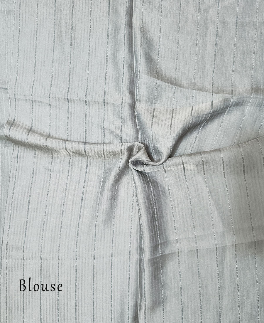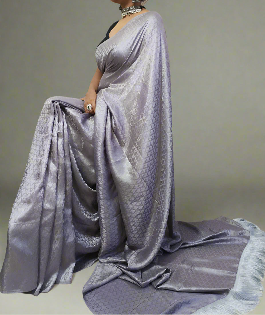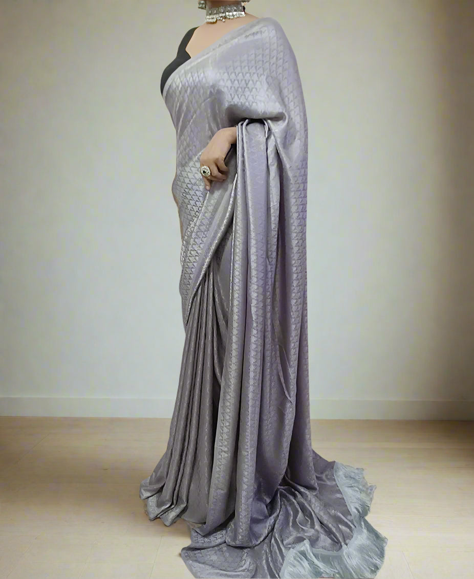 The saree's allure lies in its intricate design and meticulous detailing. A delicate play of resplendent motifs and patterns adorns the fabric, creating a visual symphony that captivates onlookers. The subdued grey hue adds a touch of understated glamour, making it a versatile choice for various occasions, from formal events to celebratory gatherings.