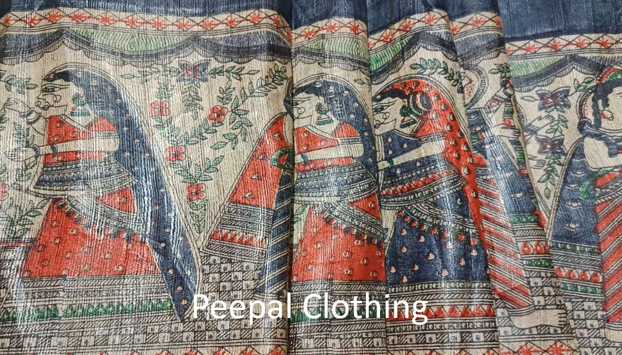 Grey Tussar Ghicha Buta Madhubani Printed Silk Saree