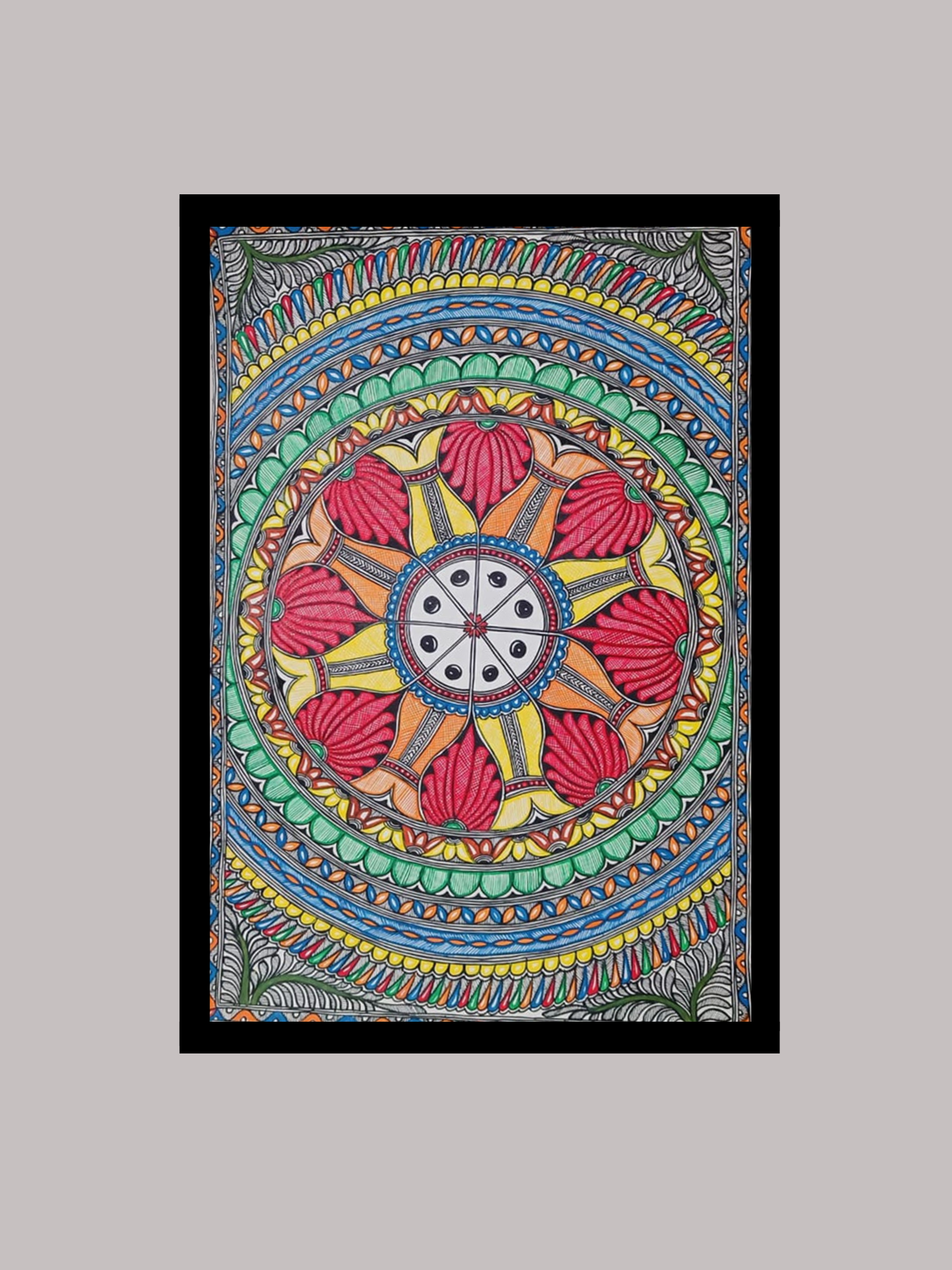 Description: Bring harmony and color to your space with this mesmerizing Madhubani Mandala. This exquisite piece of Mithila folk art features a perfectly symmetrical Lotus (Kamal) medallion, a symbol of purity, rebirth, and divinity in Indian culture. The painting is composed of concentric circles, expanding outward from a central focal point, creating a mandala-like effect that draws the eye in.