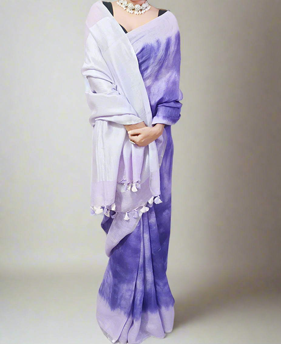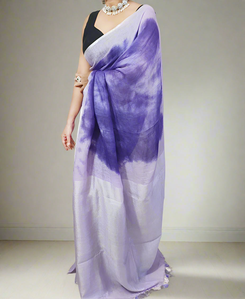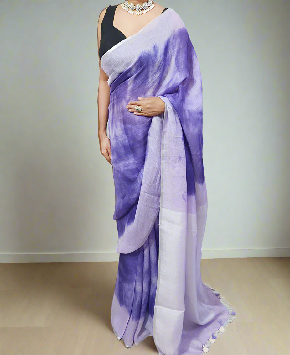 The saree's intricate tie-dye patterns, meticulously handcrafted by skilled artisans, create a unique and eye-catching design that captivates attention. The lightweight and flowing texture of pure linen drapes gracefully, enhancing the saree's overall allure. The pallu and borders are adorned with subtle yet striking details, elevating the overall aesthetic.