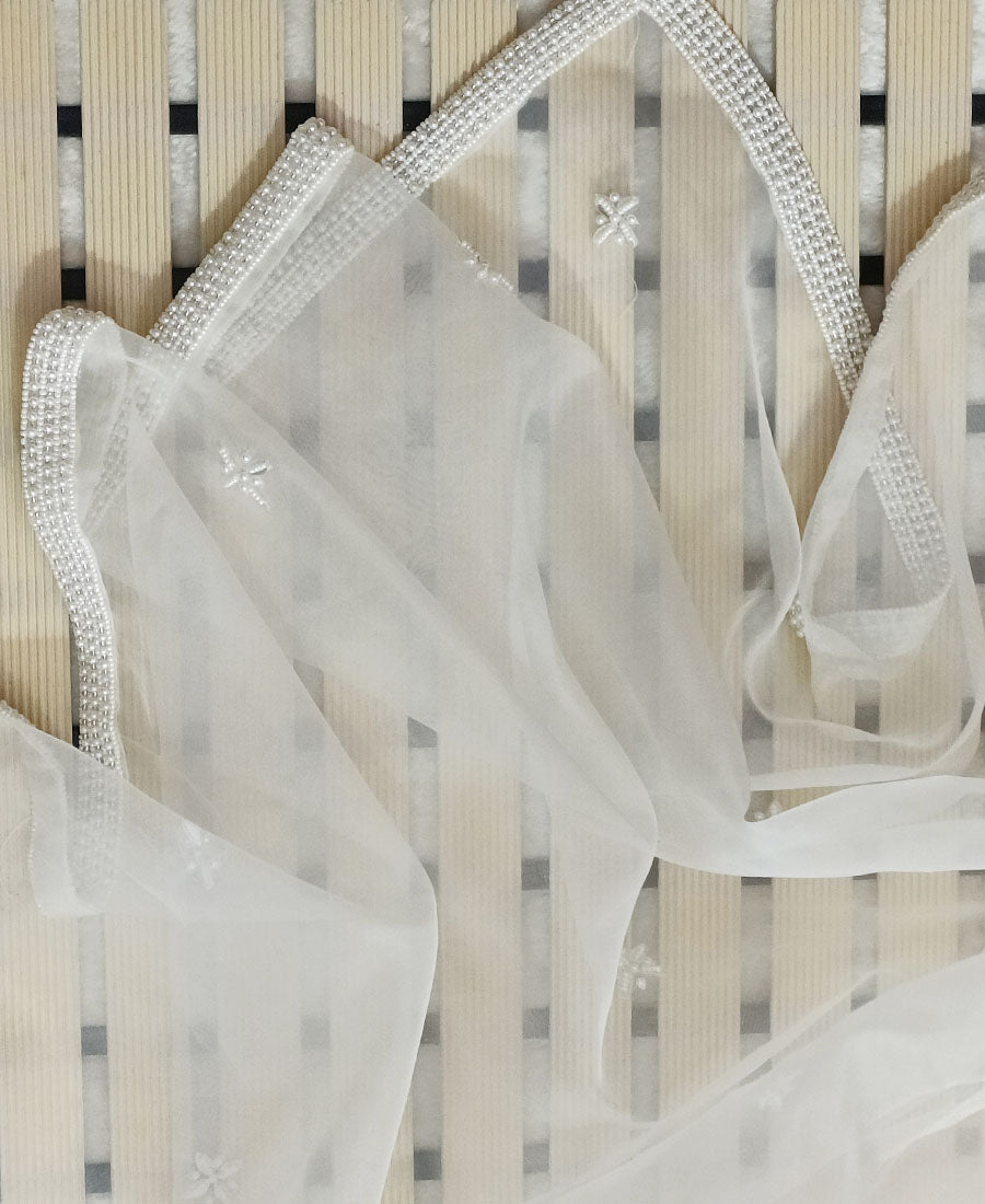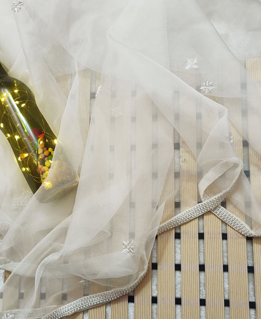 Elegantly versatile, this saree is perfect for those special moments when you want to exude an aura of refined grace and timeless beauty. Pair it with delicate jewelry and minimalistic accessories to let the saree's intricate craftsmanship take center stage, creating a look that is both sophisticated and effortlessly chic. Embrace the allure of tradition with a modern twist through this White Hand-Embroidered Organza Saree, a stunning masterpiece that captures the essence of Indian craftsmanship and timeless elegance.