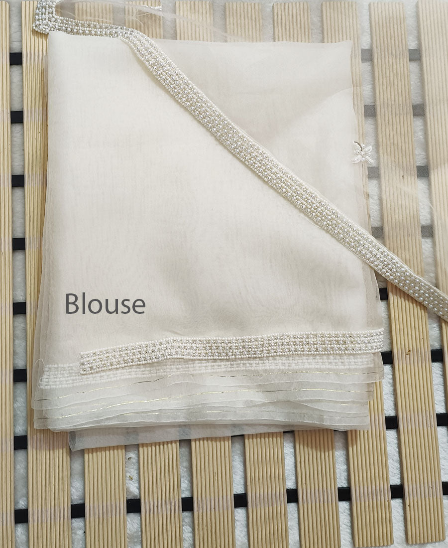 Each intricate detail has been meticulously hand-embroidered by skilled artisans, creating a mesmerizing interplay of textures and designs that accentuate the saree's ethereal charm. The lightweight and airy nature of the organza fabric ensures a graceful drape, making it ideal for both formal occasions and cultural celebrations. The subtle sheen of the fabric adds a touch of opulence, while the intricate embroidery work adds depth and dimension, making it a perfect choice for those seeking a blend of tradition and contemporary sophistication.
