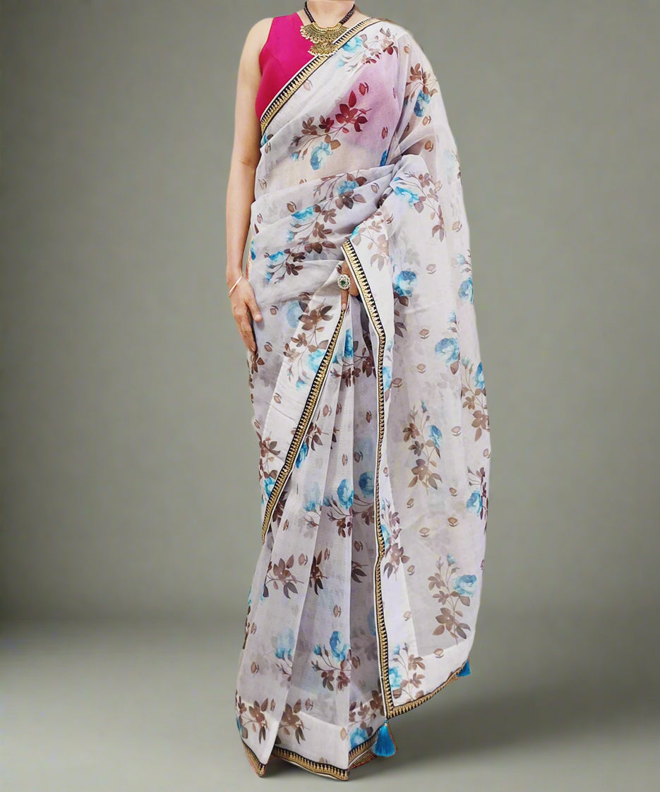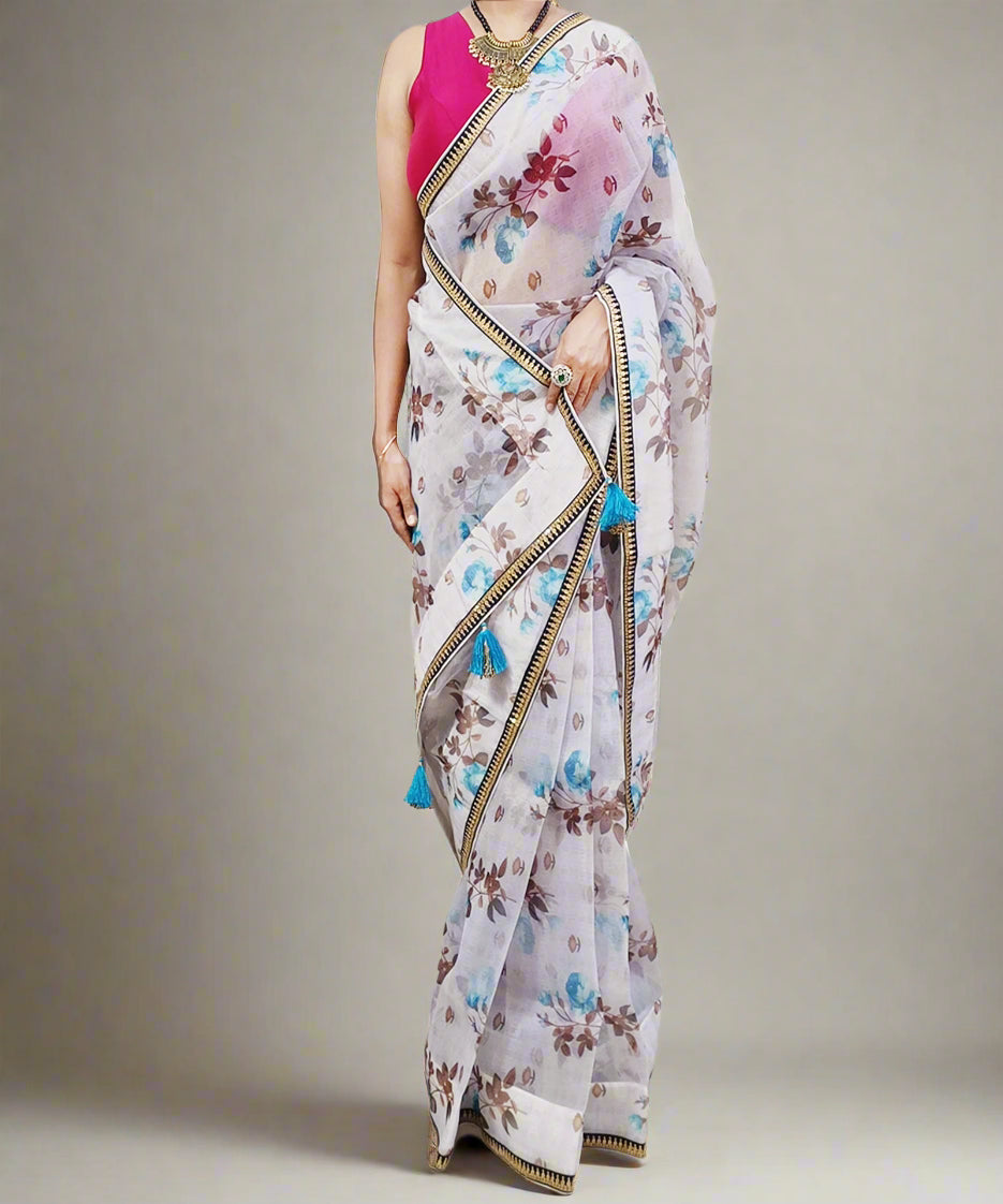 Show your ultra sophisticated look with this leaf printed organza saree with contrast raw silk blouse piece. Embellished with border lace and tassels.
