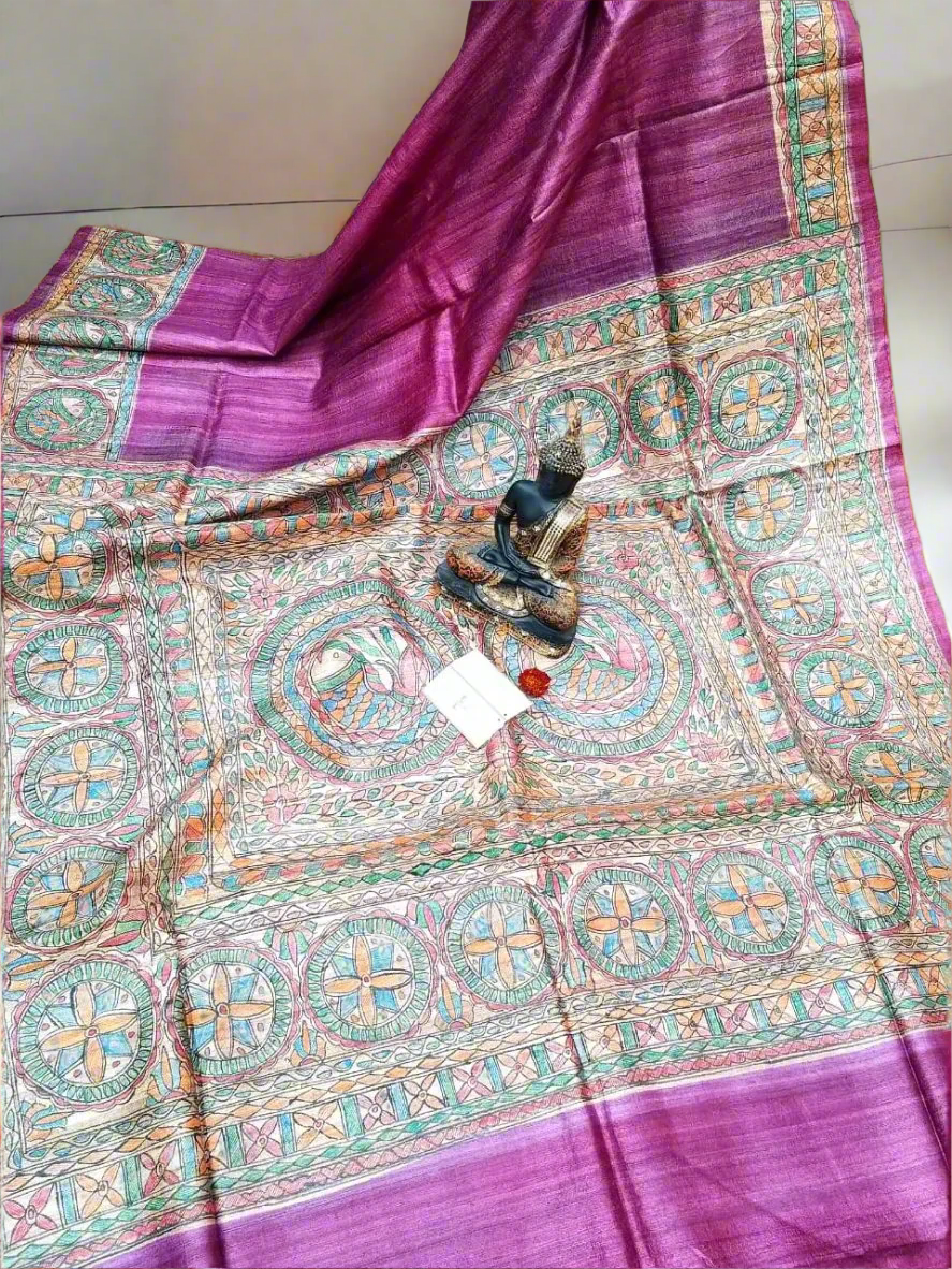 Magenta Madhubani Hand Painted Tussar Silk Saree