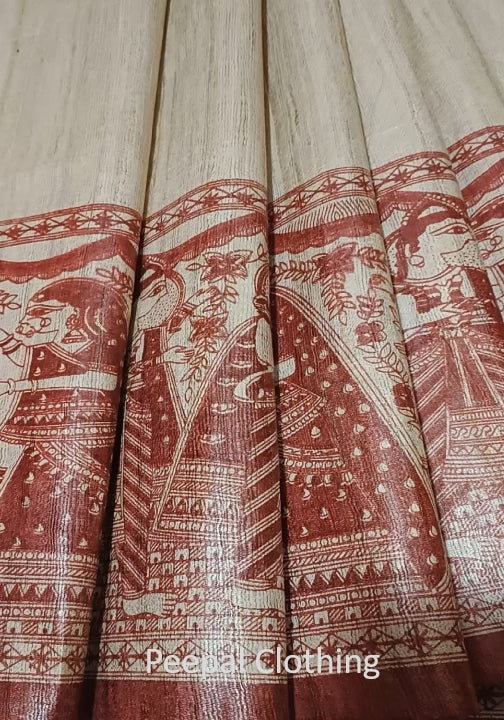 Maroon Radha-Krishna Motif Tussar Ghicha Madhubani Printed Silk Saree
