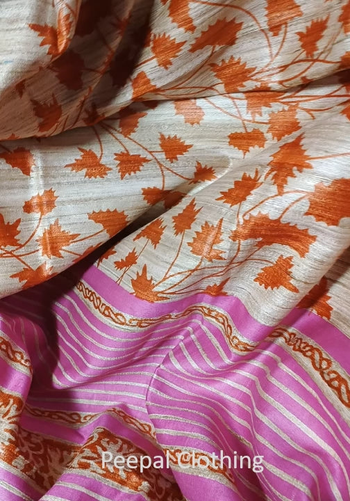 Multi color Leaf Printed Tussar Ghicha Silk Saree