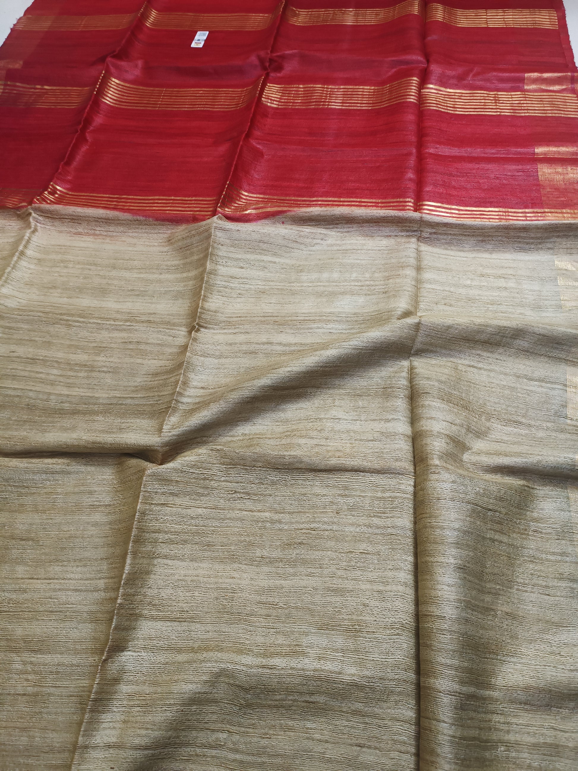 Natural And Maroon Handloon Tussar Ghicha Silk Saree