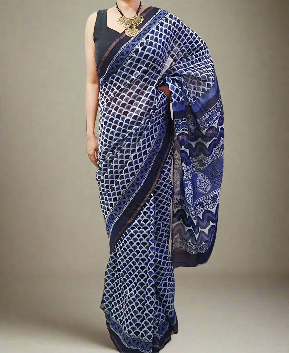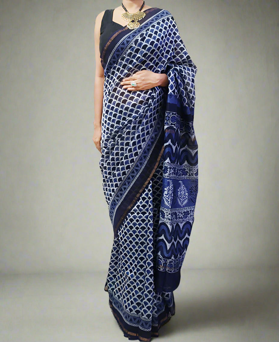 Wash & care: Gentle hand wash, Dry clean, Do not bleach.The Navy Blue Chanderi Saree with Zari Border is an exquisite blend of traditional elegance and contemporary style. Crafted from... Read More