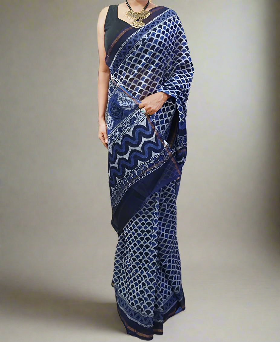 The Navy Blue Chanderi Saree with Zari Border is an exquisite blend of traditional elegance and contemporary style. Crafted from the finest Chanderi fabric, the saree showcases a rich navy blue hue that exudes sophistication. The lightweight and sheer texture of Chanderi adds a graceful drape, making it perfect for various occasions. The highlight of this saree is its intricately woven Zari Border, which adds a touch of opulence and complements the deep blue tone beautifully. The Zari work features traditional patterns that enhance the overall allure of the saree, making it a timeless wardrobe essential. Whether worn at festive gatherings, weddings, or cultural events, this Navi Blue Chanderi Saree with Zari Border is sure to make a lasting impression with its timeless charm and understated luxury.