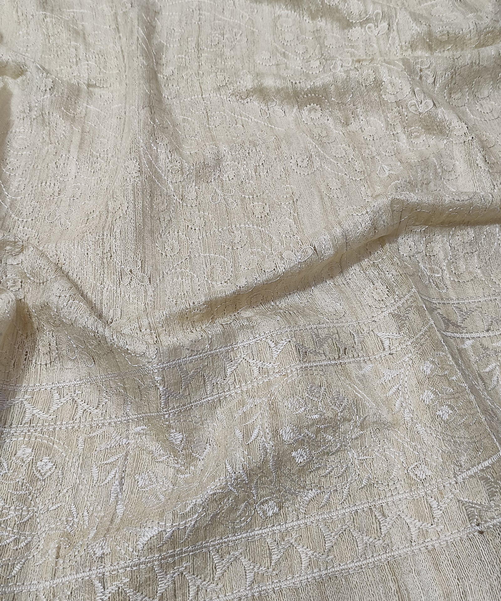 Elegance meets artistry in this exquisite Off-white Embroidered Ghicha Silk Saree. Handwoven from premium Ghicha silk, it carries a rich, natural texture and a subtle sheen that speaks of pure sophistication. The off-white base lends a timeless charm, while the delicate embroidery adds a graceful touch of tradition and finesse.