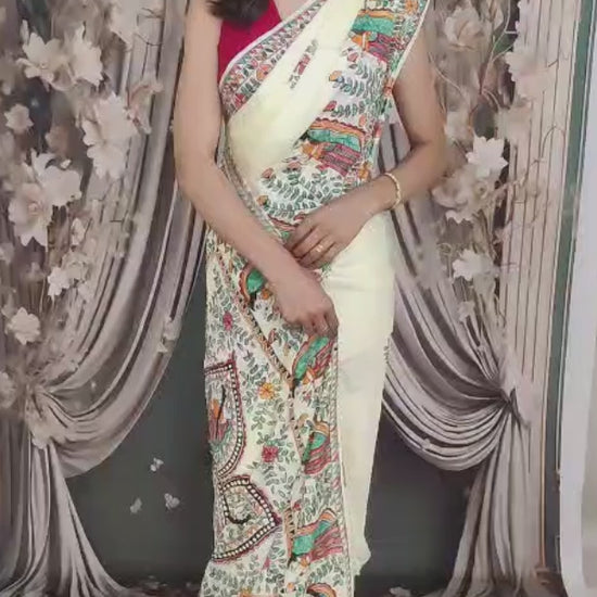 Off-white Madhubani Hand Painted Natural Crepe Saree