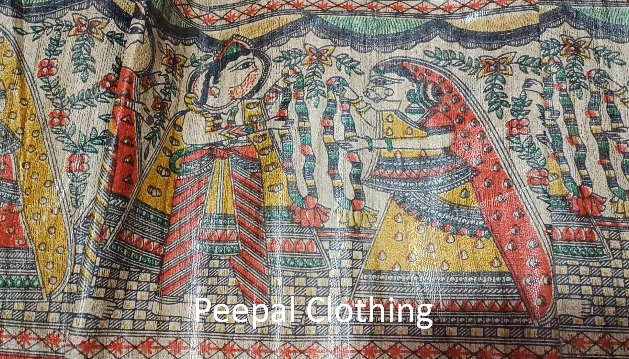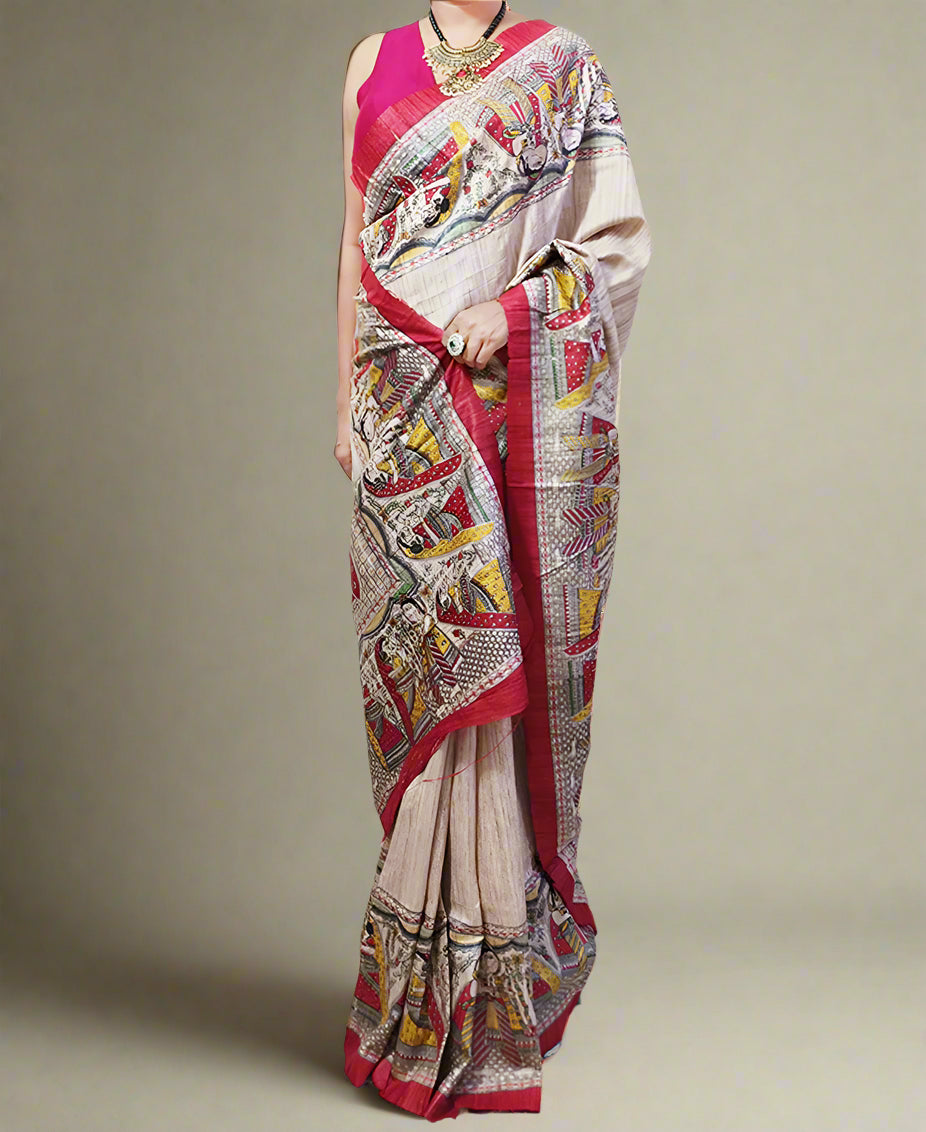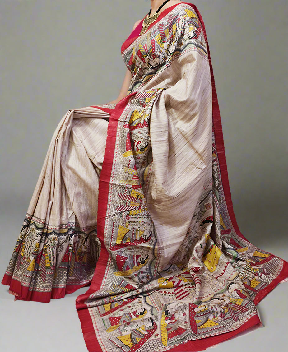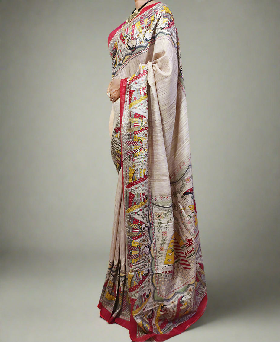 Off-white Radha-Krishna Motif Tussar Ghicha Printed Silk Saree