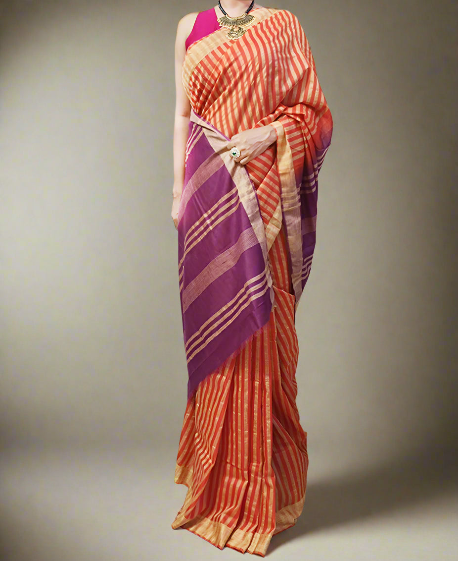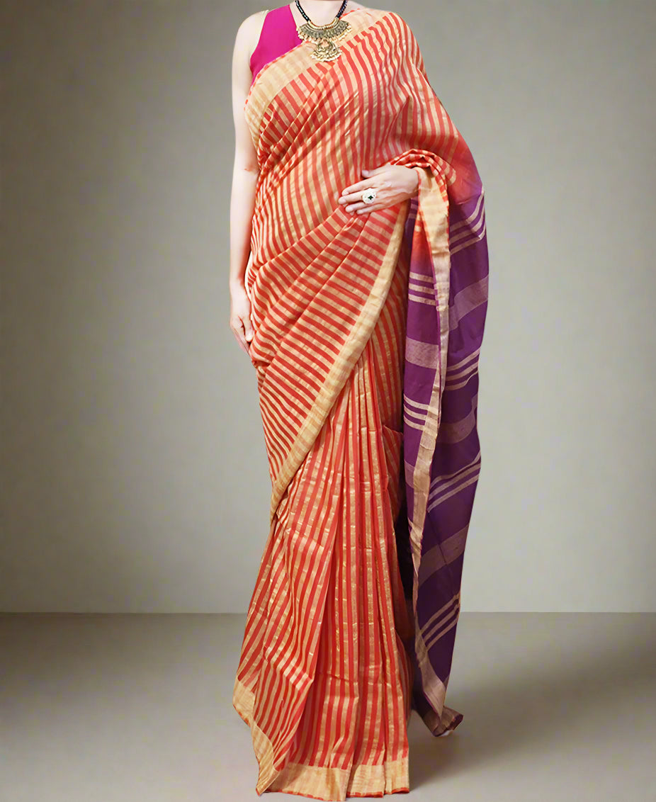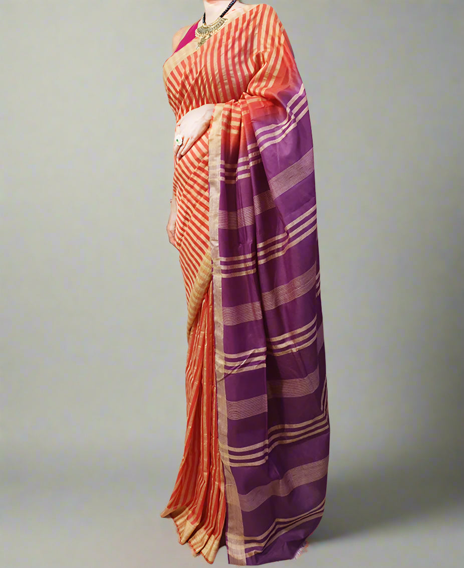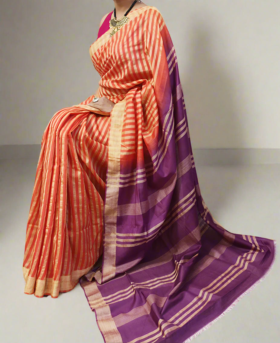 Wash & care: Dry Wash, Do Not Bleach. More DetailsThe Orange Striped Kota Silk Saree is a vibrant and elegant traditional Indian garment that effortlessly combines timeless style with... Read More