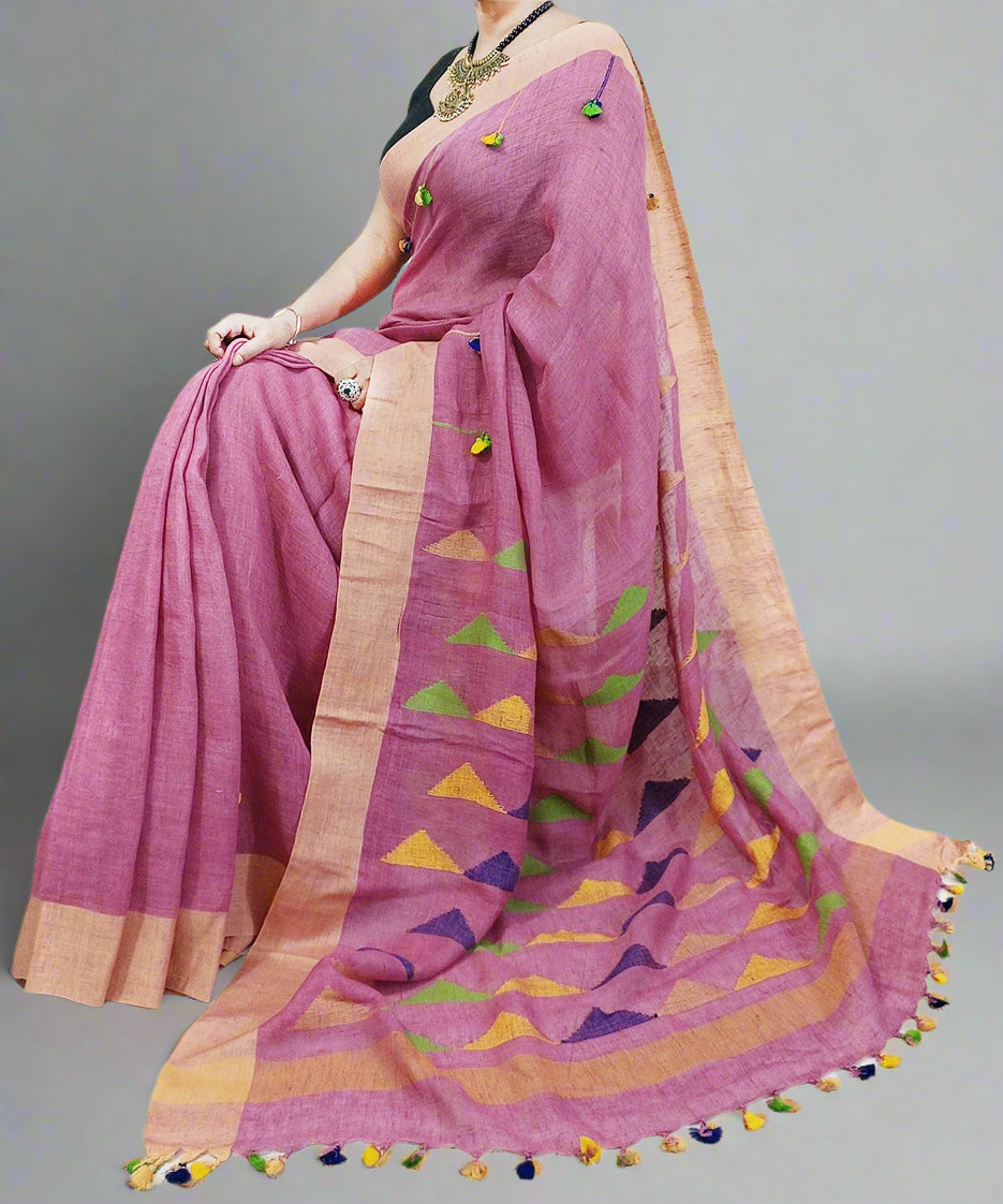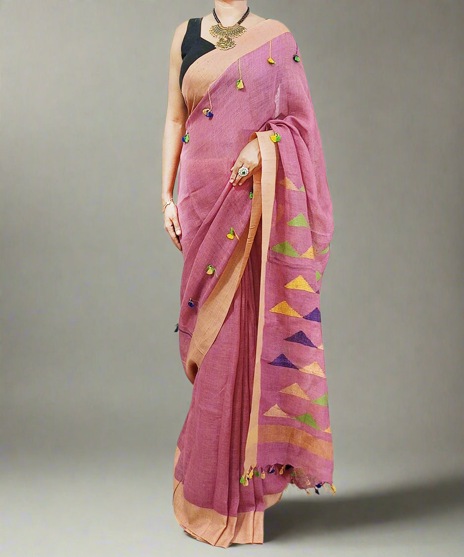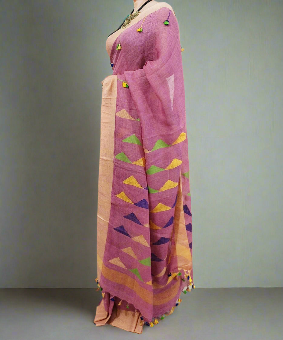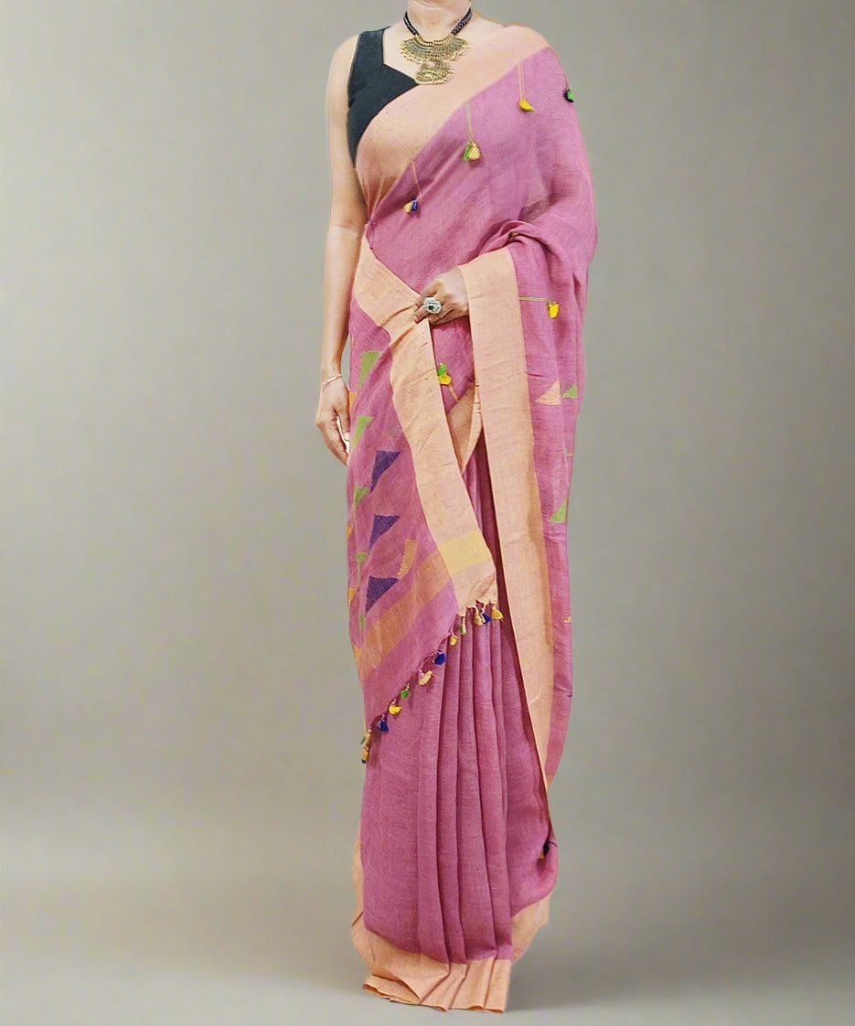 The saree features delicate floral and paisley motifs meticulously embroidered along the border and pallu, creating a mesmerizing tapestry of craftsmanship. The lightweight nature of linen makes it perfect for various occasions, from daytime events to evening soirées. Whether you're attending a wedding, festive celebration, or a formal gathering, this saree is a versatile choice that radiates sophistication. Embrace the artistry of tradition with the Peach Embroidered Linen Saree, a symbol of grace, refinement, and timeless beauty that will undoubtedly make you the center of attention.