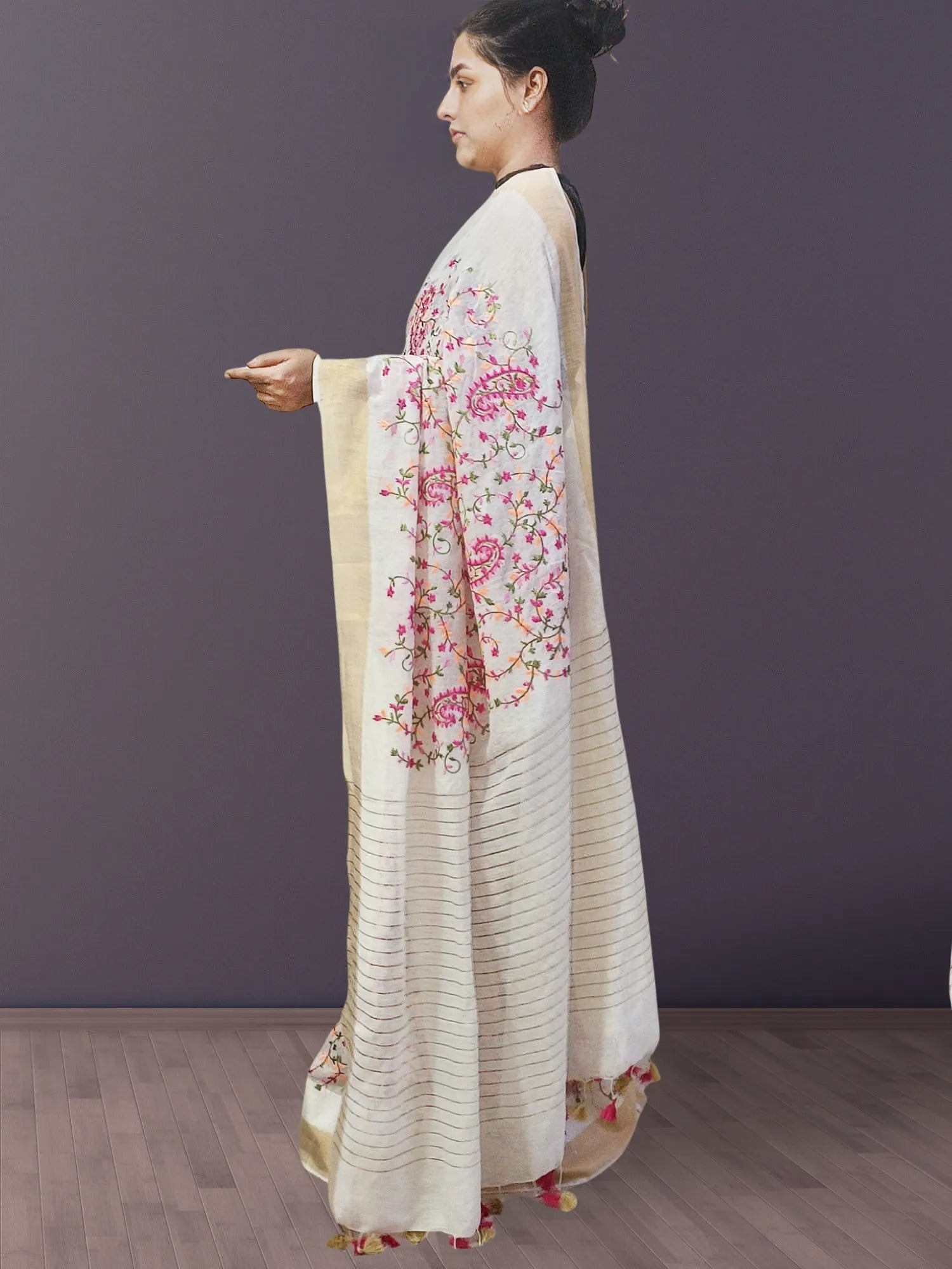 The color palette is a harmonious blend of classic and contemporary, offering a range of options to suit diverse tastes. Whether you choose a vibrant hue for a festive occasion or a subtle pastel for an understated grace, this saree effortlessly exudes sophistication. Elevate your ethnic wardrobe with the Embroidered Silk Linen Saree, a timeless ensemble that pays homage to the art of weaving and embroidery, making every moment a cherished and stylish affair.