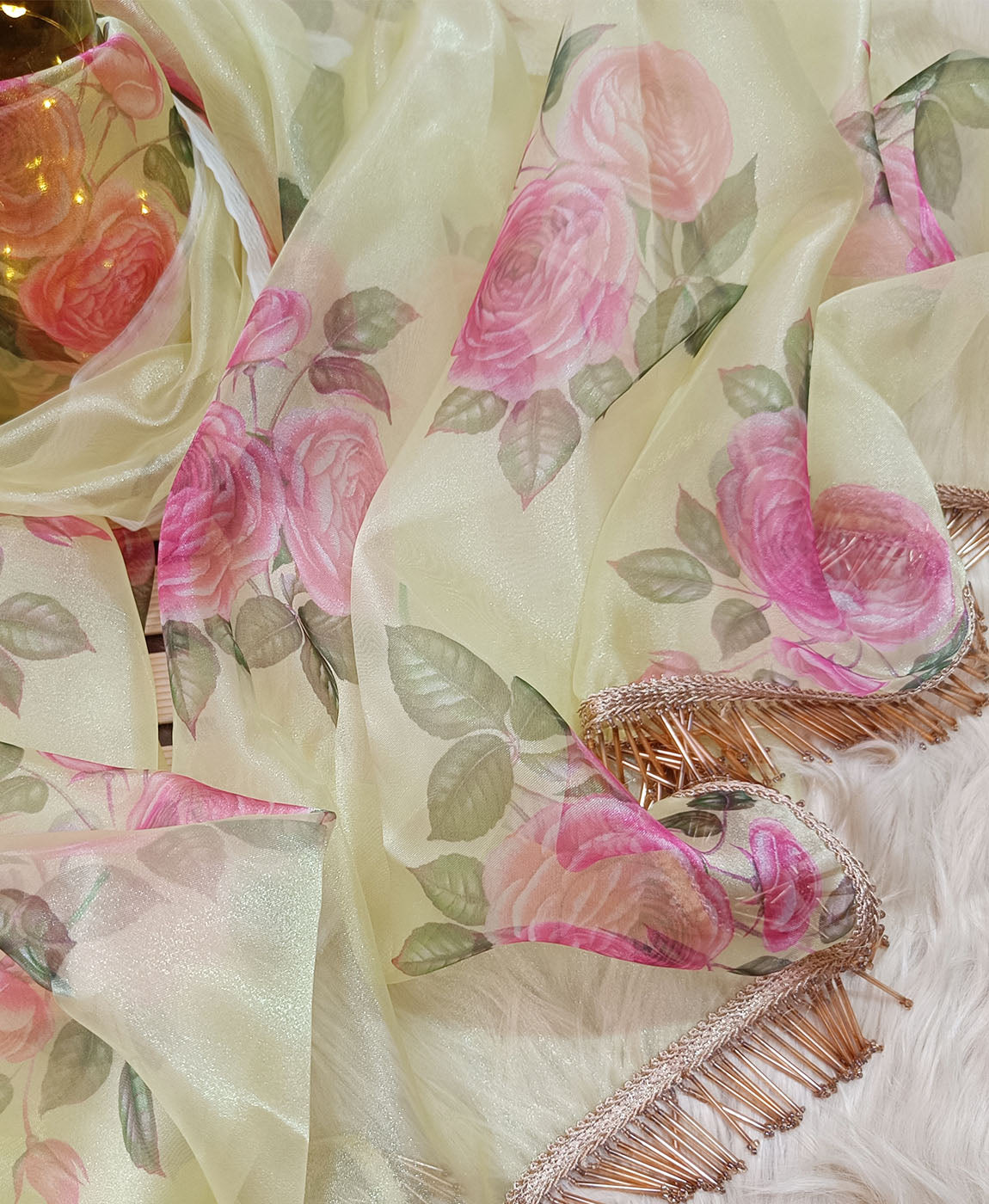 Show your ultra sophisticated look with this floral printed organza saree with contrast crepe blouse piece. Embellished with tassels.