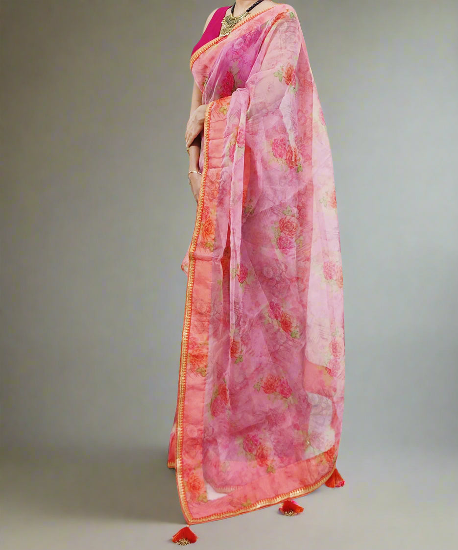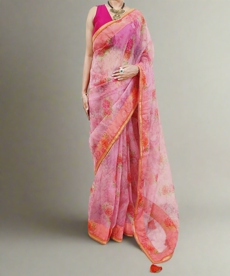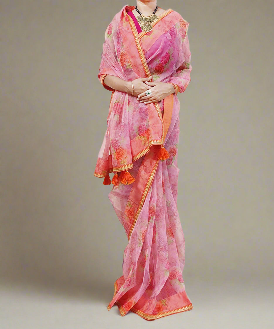 Show your ultra sophisticated look with this rose pink printed silk organza saree with contrast raw silk blouse piece. Embellished with border lace and tassels.