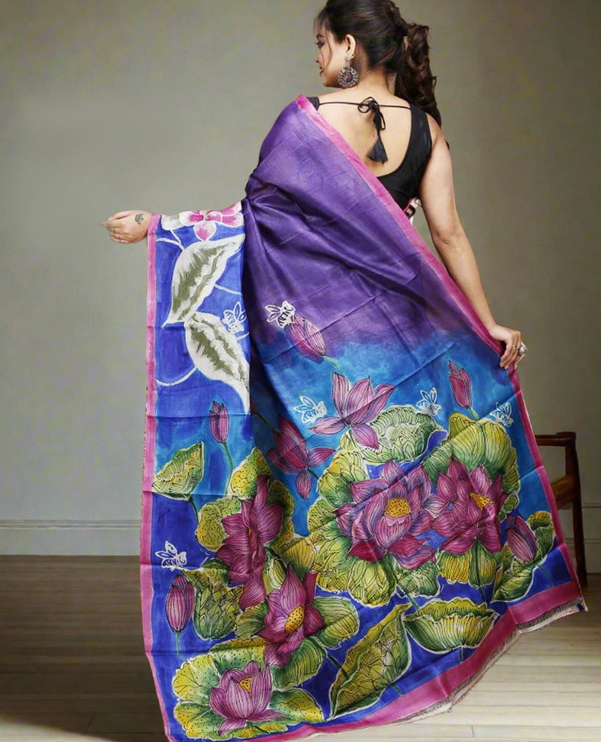 Kalamkari is derived from the word 'Kalam' (pen) and 'Kari' (craftsmanship). Earlier used to be named as 'Pattachitra' a sanskrit word where 'patta' means cloth and 'chitra' is picture. The art of hand painting done on fabrics with the use of a pen or block. Kalamkari patterns used on kalamkari sarees tend to have a perspective that appears to be viewed from the top. The same perspective is used to create the images because these were thought to be scenes viewed by celestial entities. Earlier Kalamkari art was as religious paintings that depicted Indian Gods. In current generation printed kalamkari is a new craze as it is a combination of traditional and modern trends. Fashion industry also helped artisans for practicing this art and also beautifully portrayed kalamkari sarees on fashion runways and got a welcoming response.