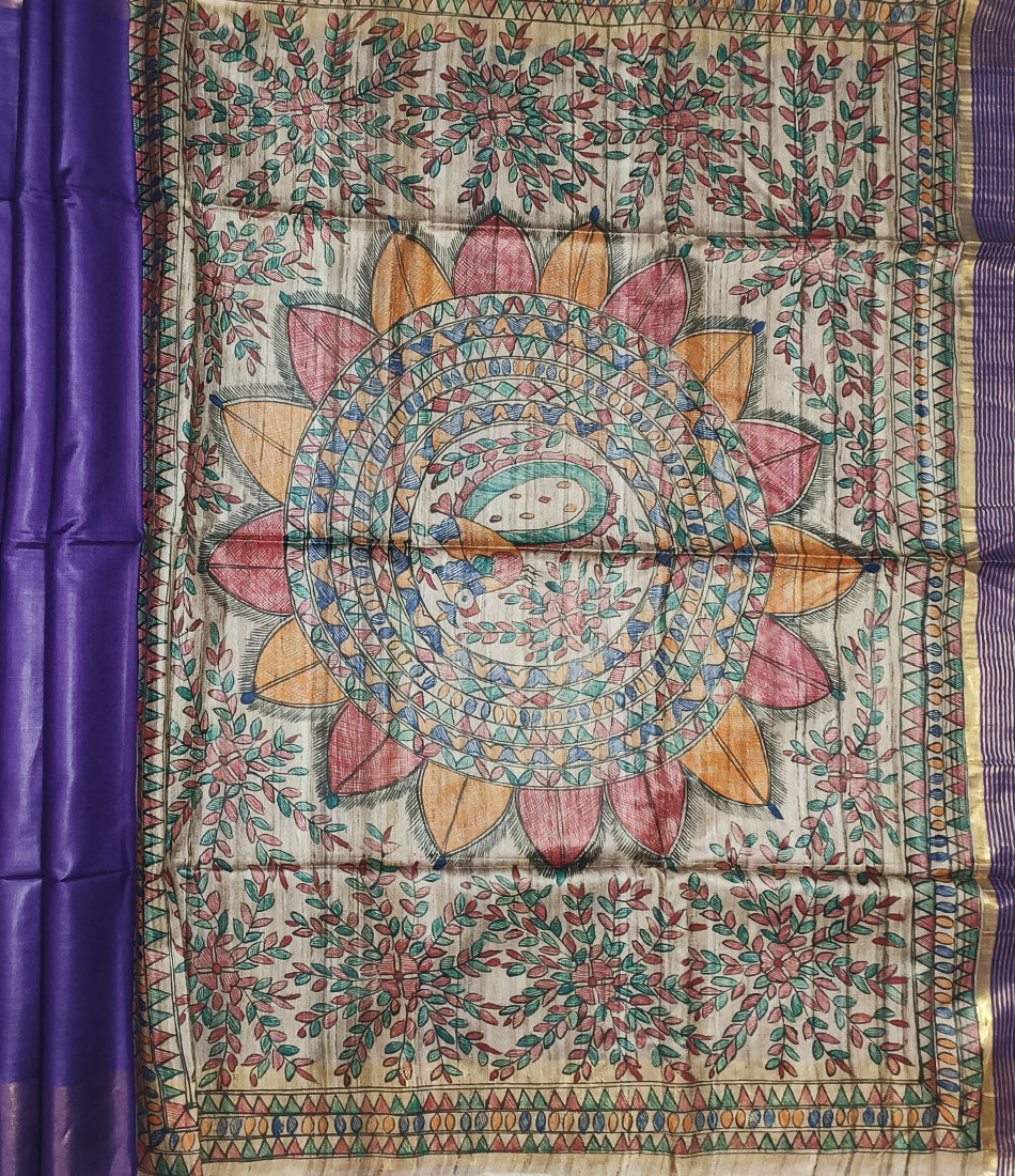 Purple Madhubani Hand Painted Pallu Silk Saree