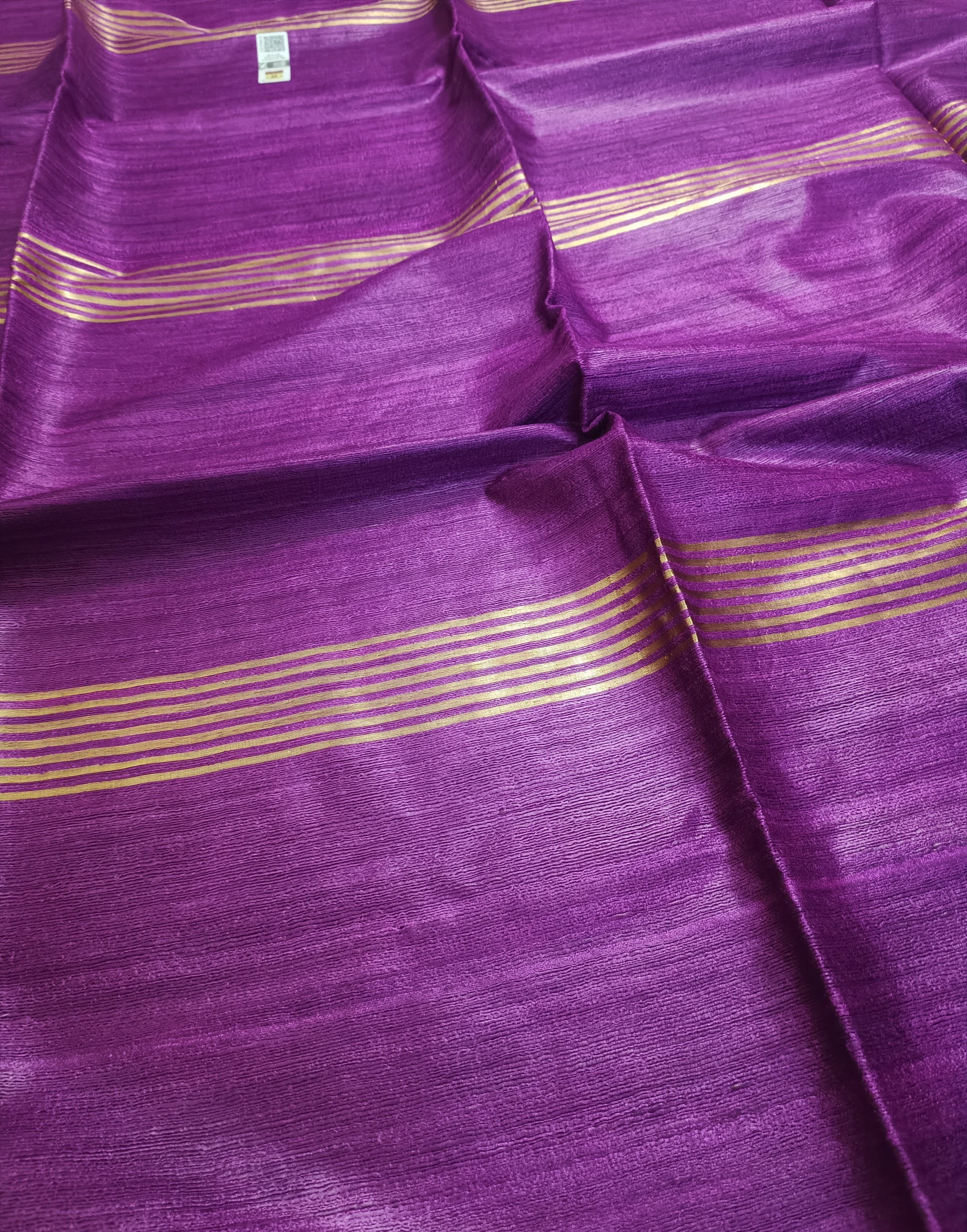 Enrich your wardrobe with elegant single dye tussar ghicha silk sarees with zari border and running blouse piece. Choose this purple zari border handloom tussar ghicha silk saree made from high quality silk yarn to complete your elegant yet classy look. An effortless style statement for your formal and party look.