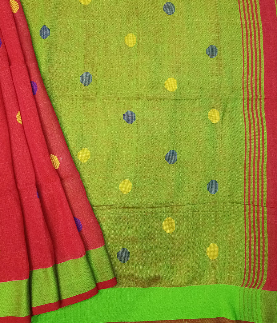 Drape this mirror embroidered red linen saree with narrow silver border around you and stand out from the crowd. Linen sarees are best for office wear. One can go with simple neat look by accessorizing it with minimal jewellery and clean hair do. Pair your sophisticated linen saree with matching or plain blouse. Make it a style statement by creative draping and contrast blouse. Because of the simplicity of a linen saree, you can be more daring with your accessories.