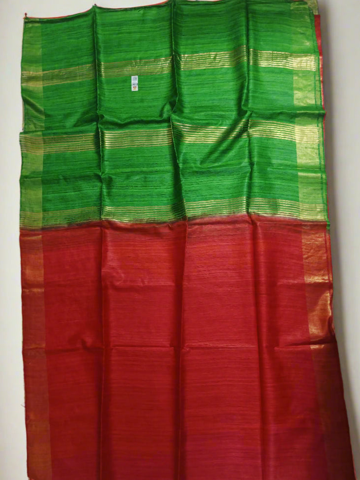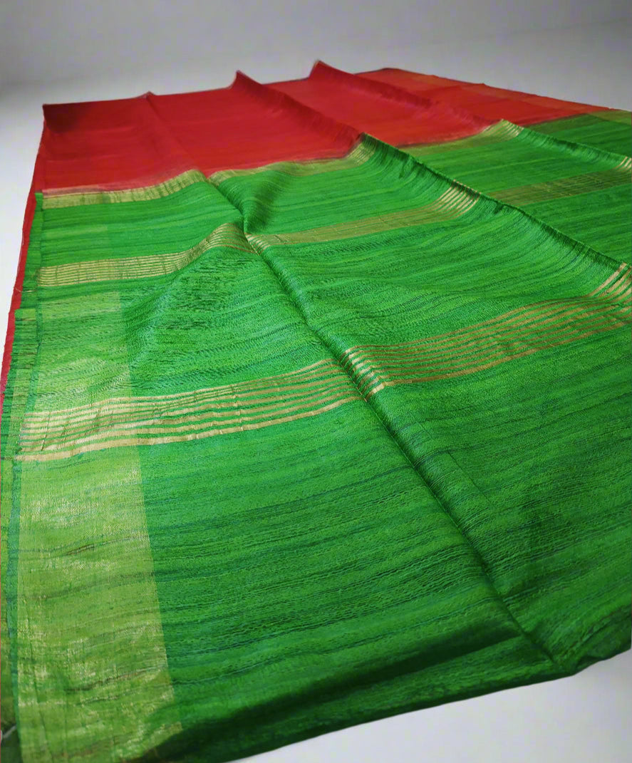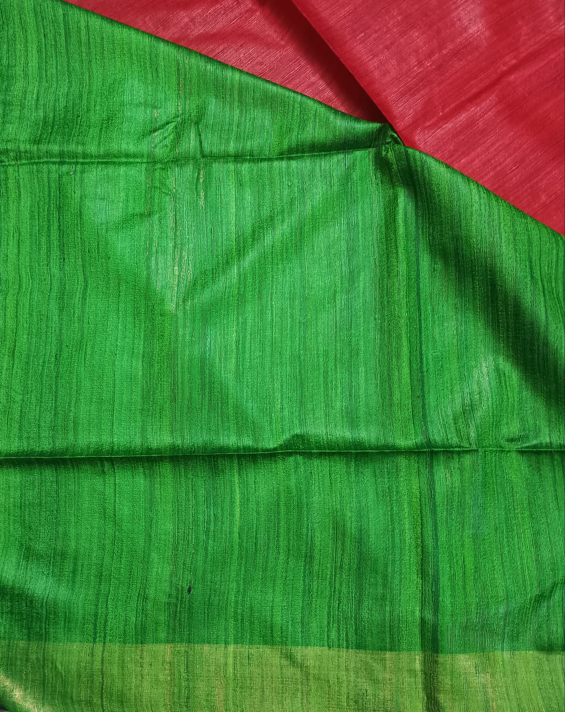 Red And Green Handloon Tussar Ghicha Silk Saree