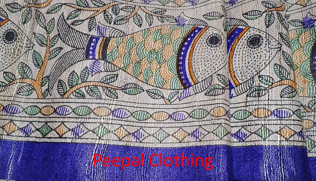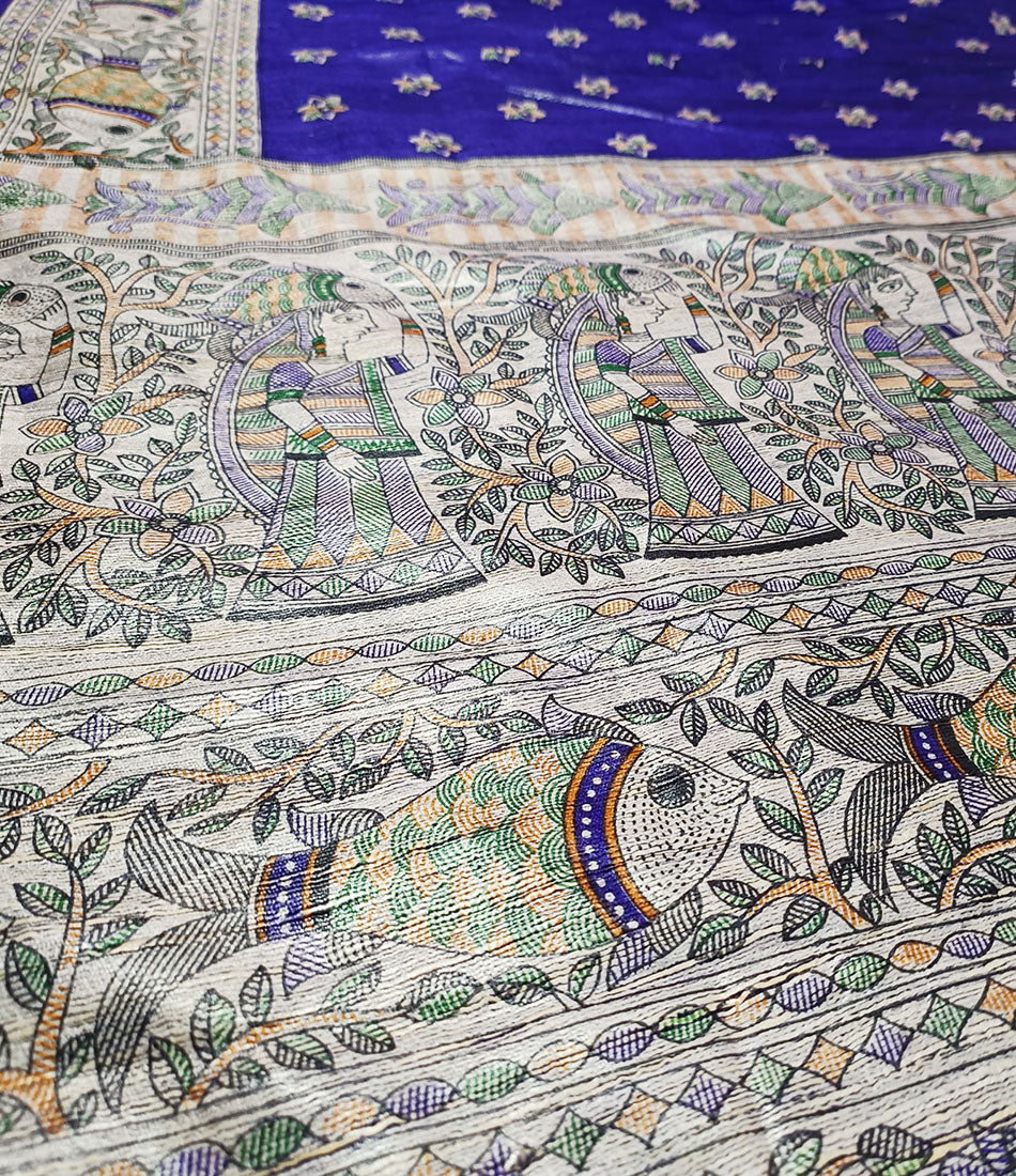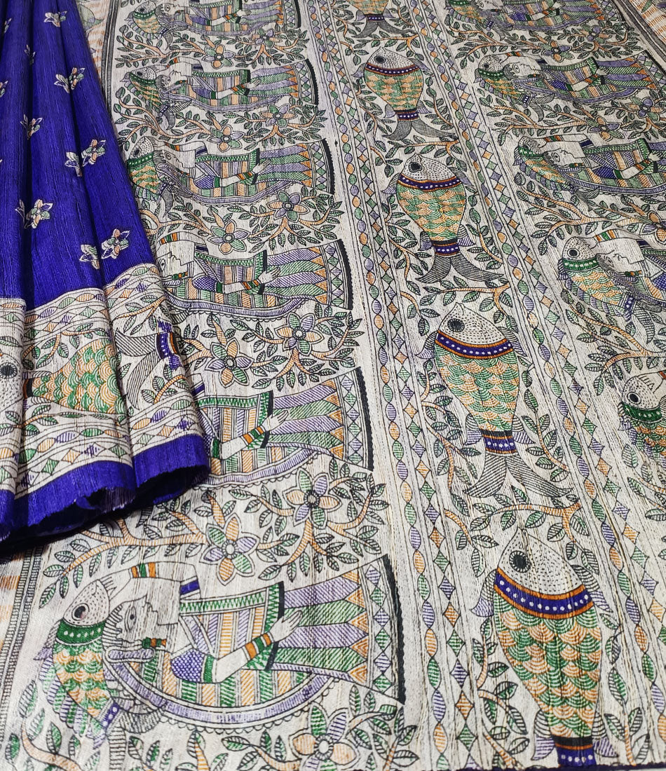 Royal Blue Tussar Ghicha Madhubani Printed Silk Saree
