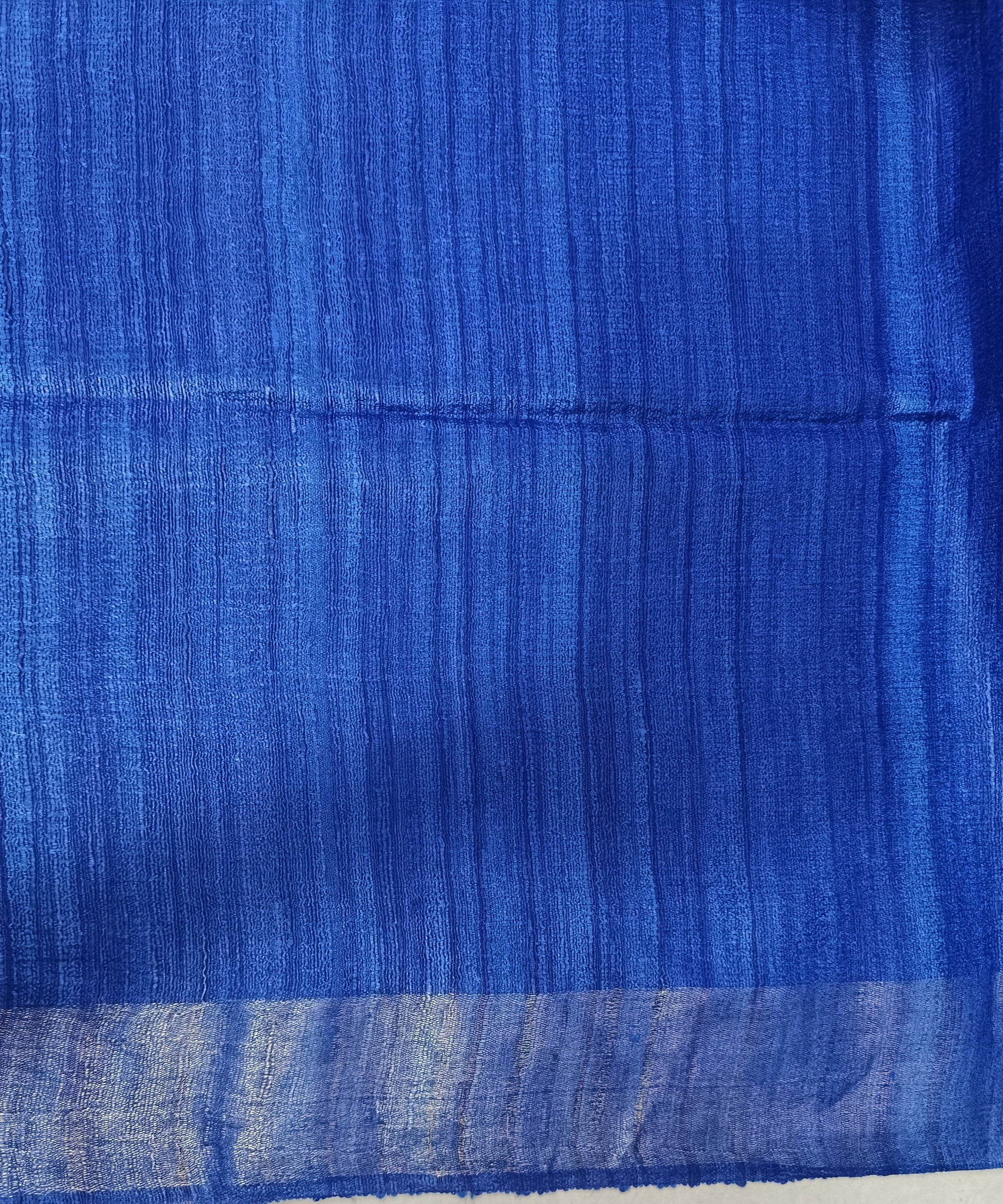 Enrich your wardrobe with elegant single dye tussar ghicha silk sarees with zari border and running blouse piece. Choose this royal blue zari border handloom tussar ghicha silk saree made from high quality silk yarn to complete your elegant yet classy look. An effortless style statement for your formal and party look.