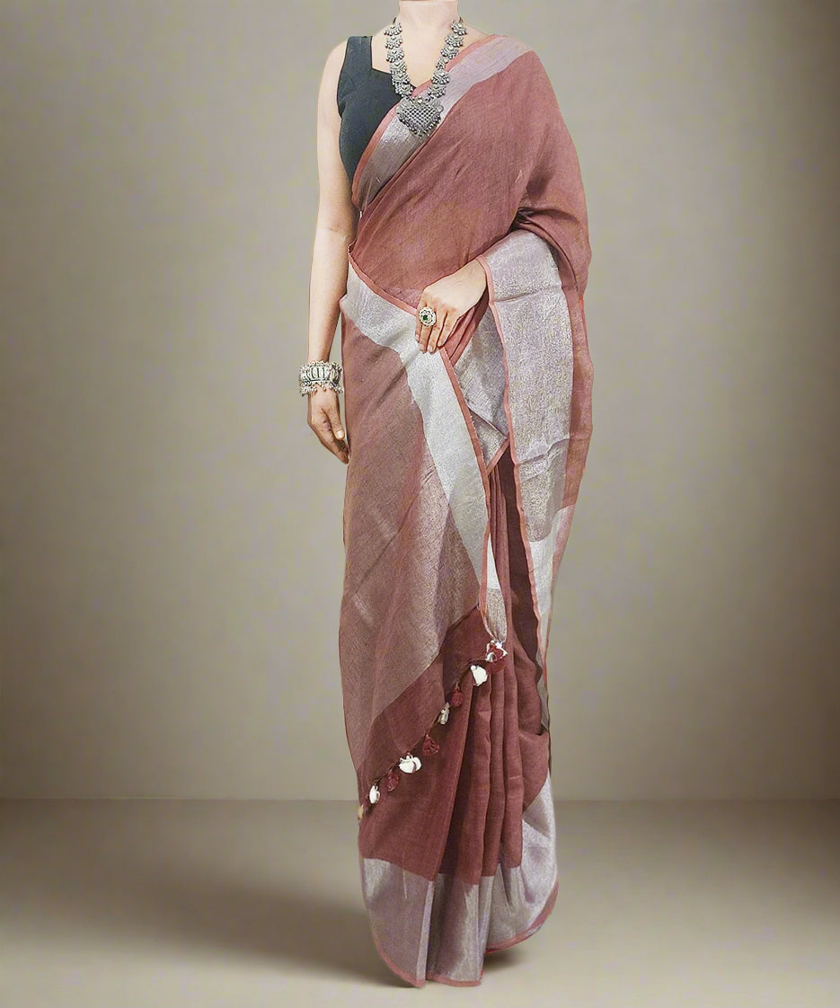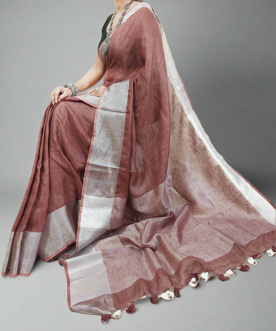 Drape this rust linen saree with narrow silver border around you and stand out from the crowd. Linen sarees are best for office wear. One can go with simple neat look by accessorizing it with minimal jewellery and clean hair do. Pair your sophisticated linen saree with matching or plain blouse. Make it a style statement by creative draping and contrast blouse. Because of the simplicity of a linen saree, you can be more daring with your accessories.