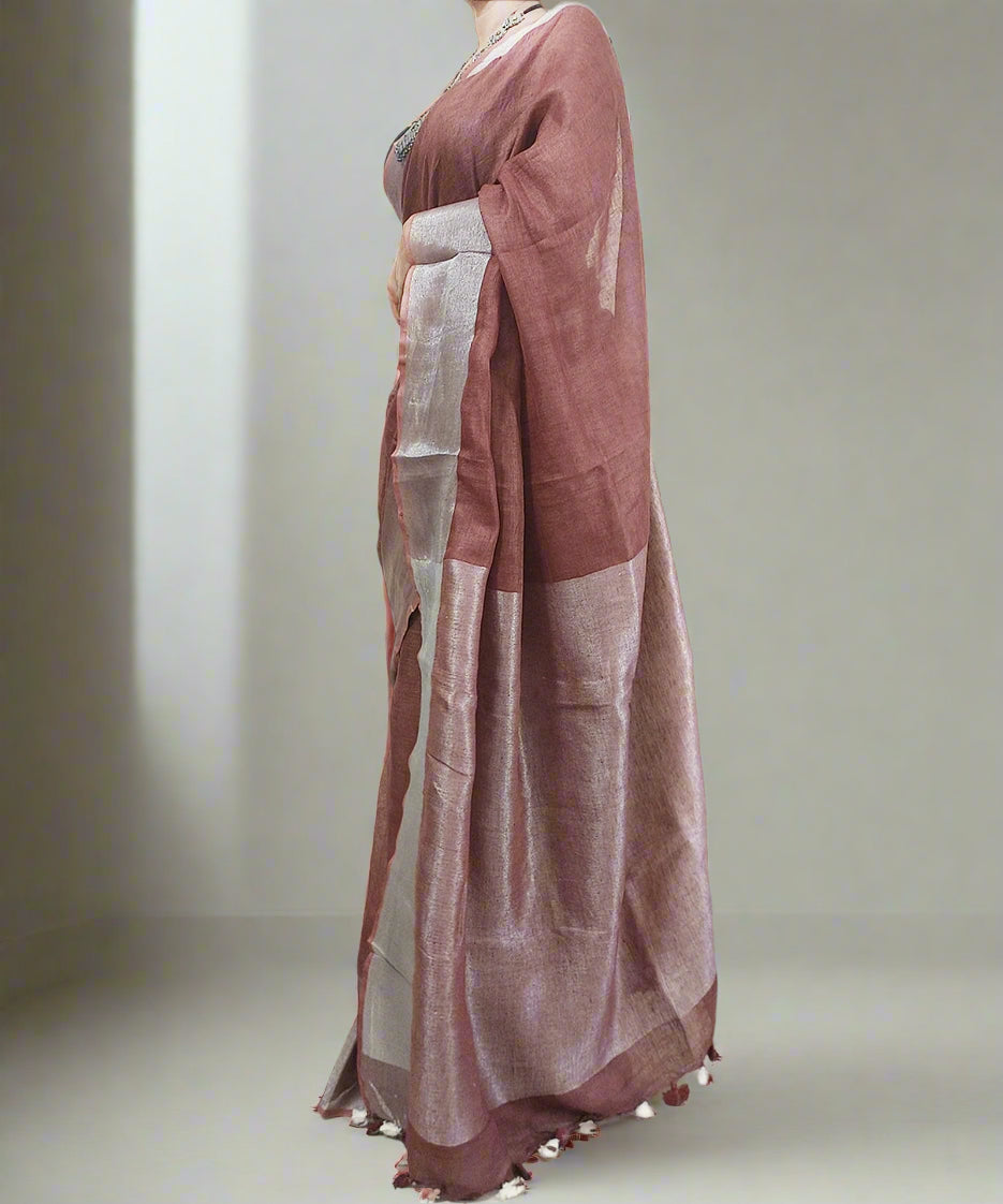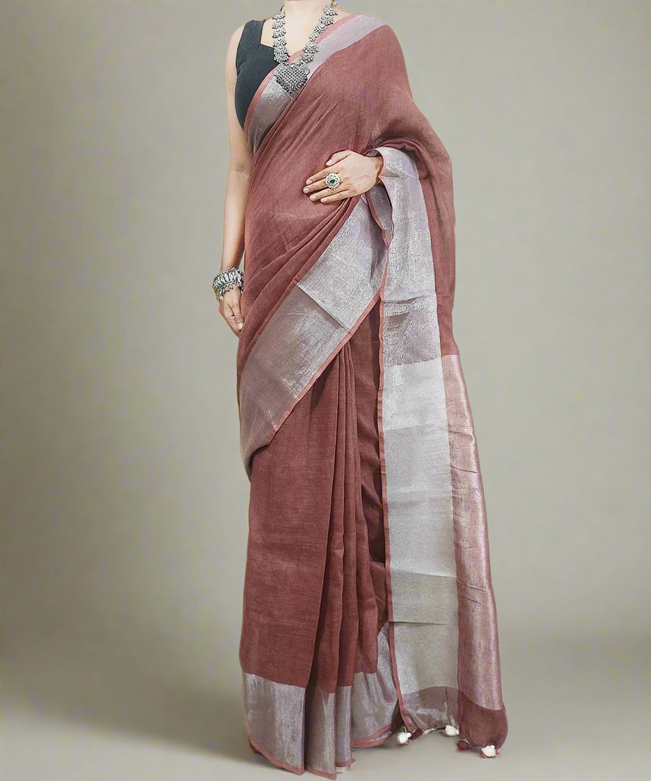 Wash Wash & care: Gentle hand wash, Dry clean, Do not bleach. Dry in shade.Drape this rust linen saree with narrow silver border around you and stand out from the crowd. Linen sarees are... Read More
