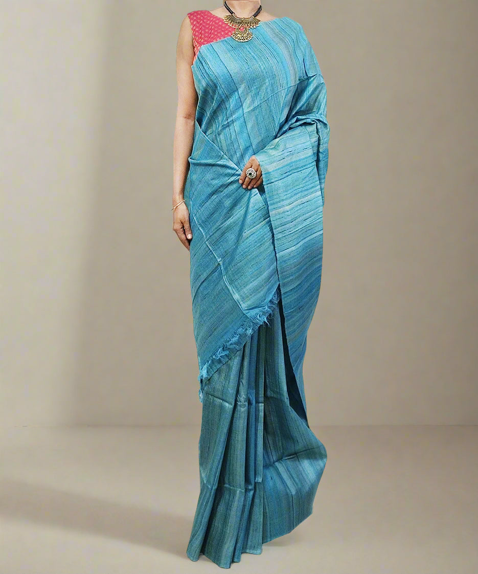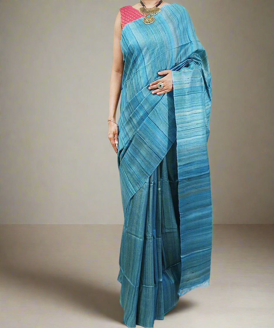 Elegance meets comfort as the lightweight Tussar silk ensures a graceful drape, allowing you to move with ease. Embrace the allure of tradition with a contemporary twist in the Sky Blue Desi Tussar Silk Saree, a sartorial masterpiece that reflects the timeless beauty of Indian craftsmanship.