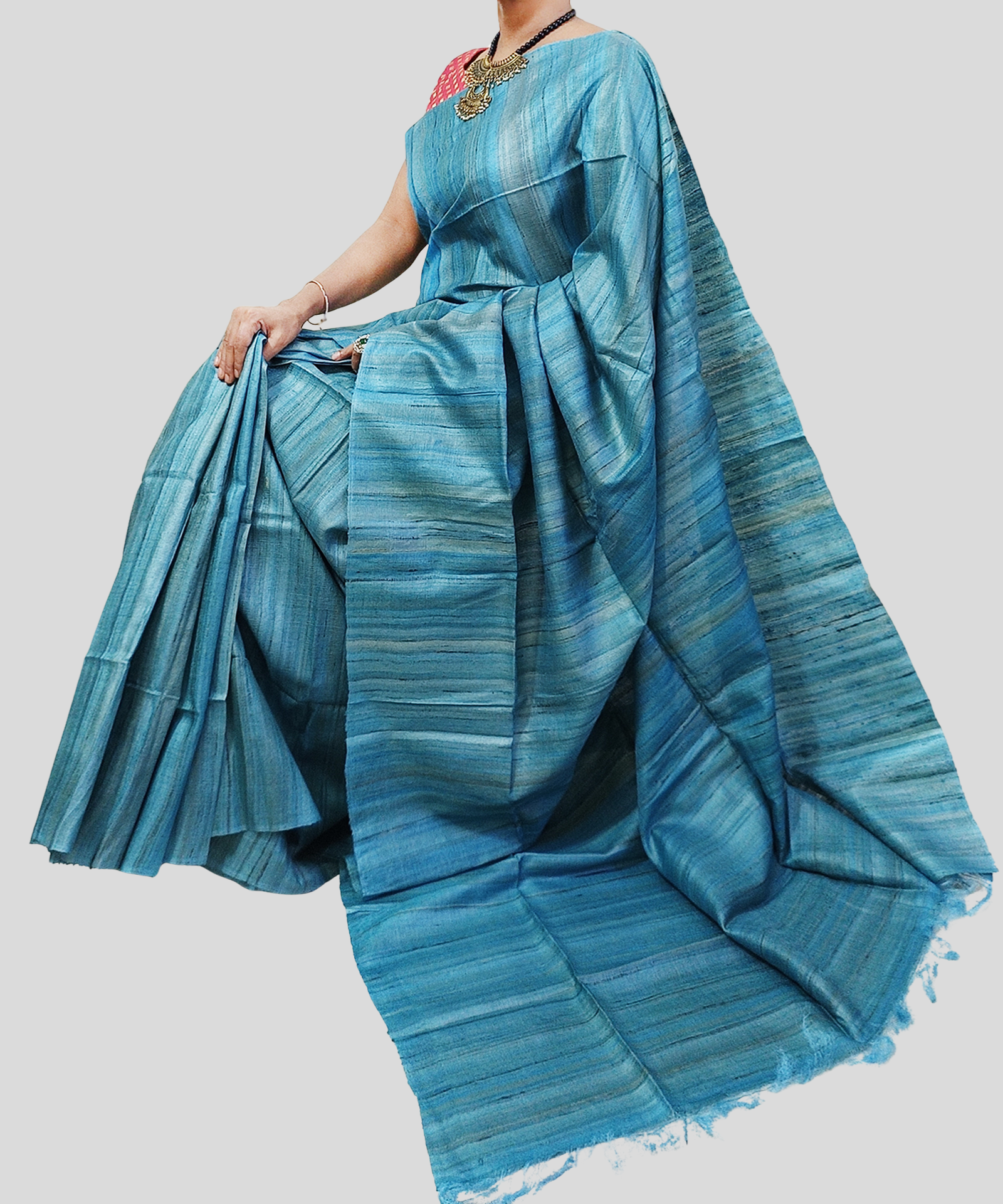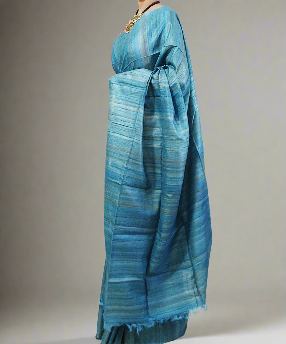 Indulge in timeless elegance with our Sky Blue Desi Tussar Silk Saree, a masterpiece that seamlessly blends traditional craftsmanship with contemporary allure. The luxurious silk fabric, derived from the wild silk-producing Tussar silkworms, imparts a distinctive texture and natural sheen to the saree. The enchanting sky blue hue elevates its charm, symbolizing serenity and sophistication.