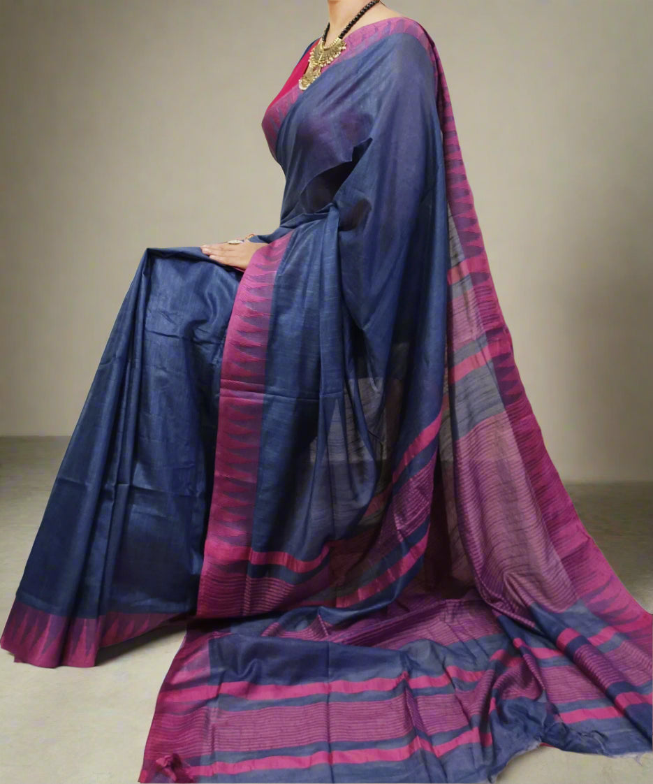 Step into timeless elegance with our Temple Border Navy Blue Kota Viscose Saree. Crafted with precision, this saree exudes grace and sophistication. The rich navy blue hue complements various skin tones, making it a versatile choice for any occasion. The luxurious Kota viscose fabric drapes beautifully, offering a fluid silhouette that gracefully enhances your femininity.
