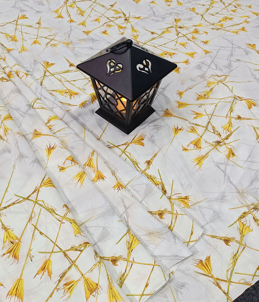 Show your ultra sophisticated look with this floral printed crepe saree with black crepe blouse piece. Embellished with border lace and tassels.