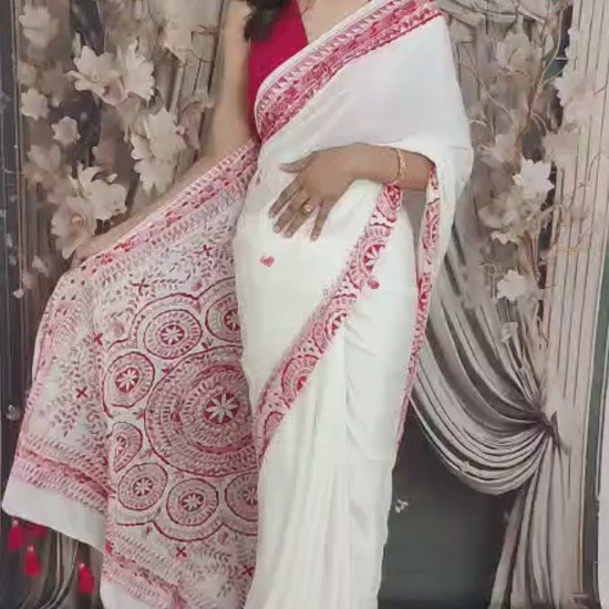 Epitome of grace and artistry, this White Madhubani Hand Painted Natural Crepe Saree is a true collector’s piece. The soft white base serves as a canvas for exquisite Madhubani motifs, all hand-painted with precision and love. Made with breathable natural crepe, it ensures effortless comfort with a regal drape. Whether for weddings, festive functions, or cultural events, this Madhubani handloom saree is a statement of elegance and tradition.