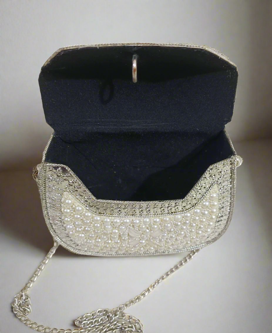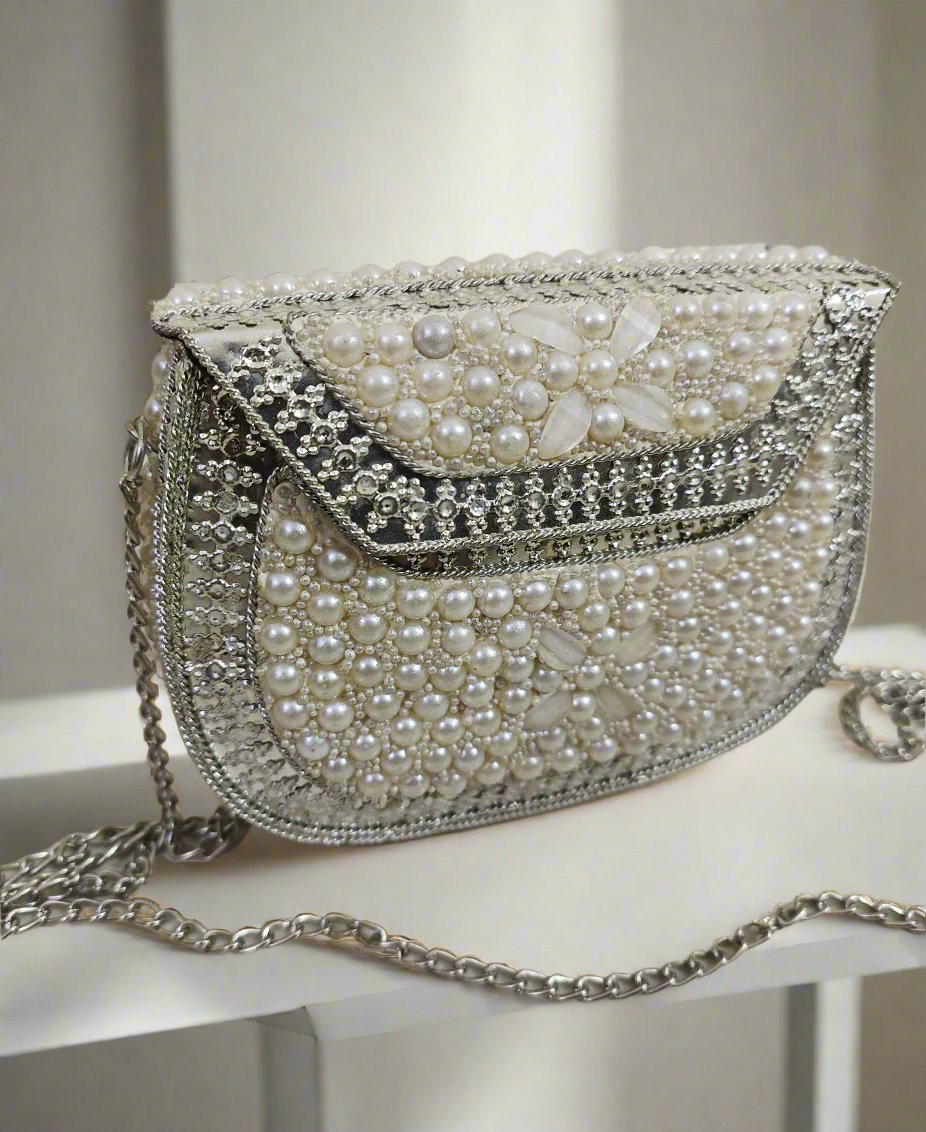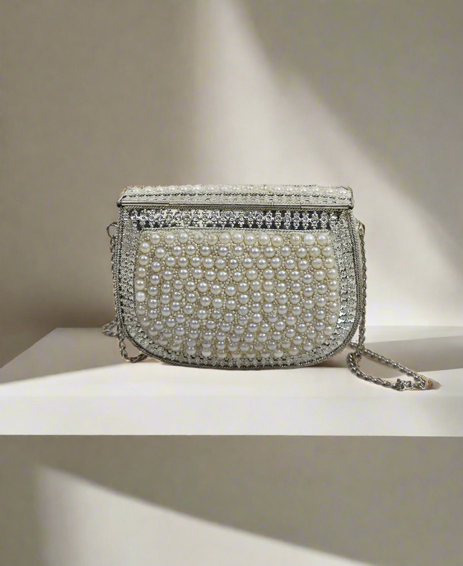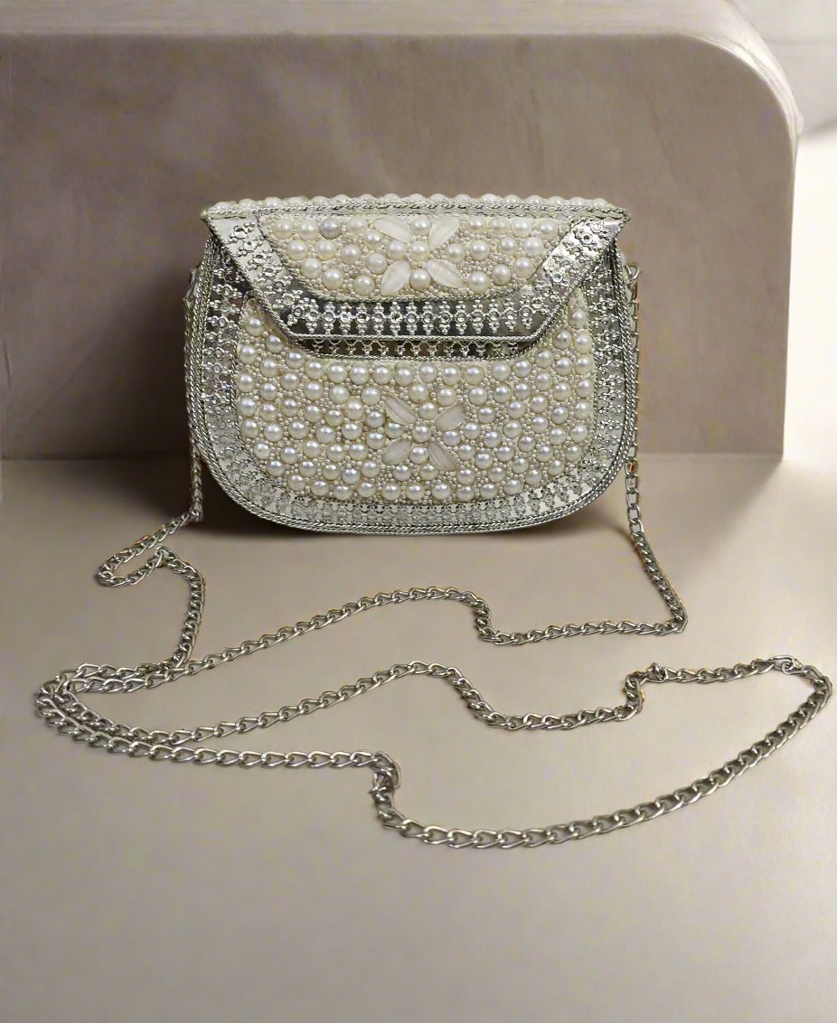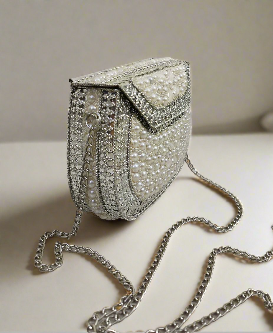 White Pearl Embellished Clutch Handbag