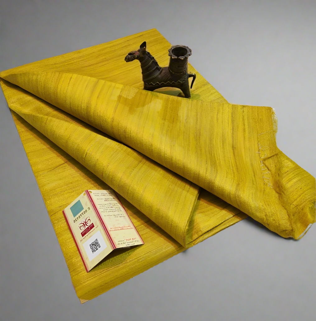 Enrich your wardrobe with elegant single dye tussar ghicha silk sarees with plain border and running blouse piece. Choose this yellow handloom tussar ghicha silk saree made from high quality silk yarn to complete your elegant yet classy look. An effortless style statement for your formal and party look.