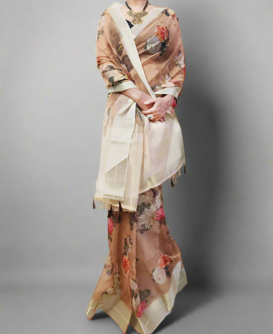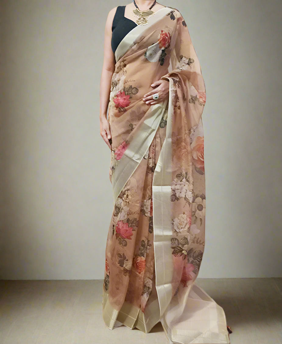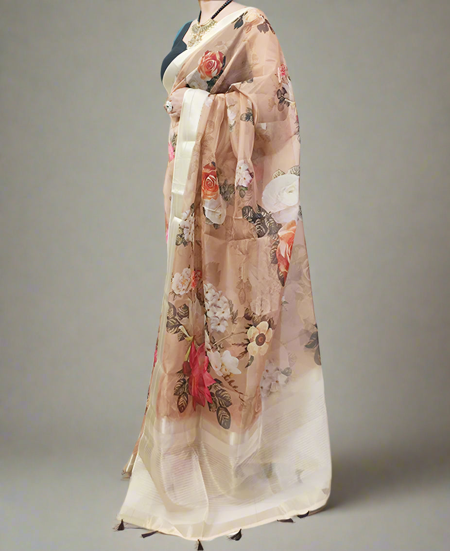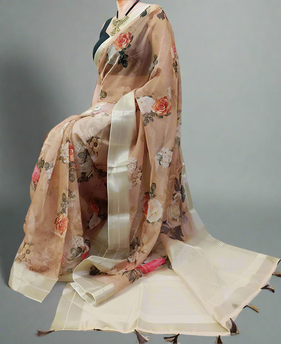 The Zari Border Floral Printed Organza Saree is a sublime fusion of traditional elegance and contemporary flair. Crafted with finesse, the saree features a luxurious organza fabric that exudes a delicate sheen, enhancing its overall appeal. The exquisite floral print, resplendent with vibrant hues, adds a touch of timeless charm to the saree, making it perfect for various occasions. The zari border intricately woven along the edges elevates the ensemble, providing a regal and sophisticated touch. The lightweight and breathable nature of organza ensures comfort throughout wear, allowing the saree to drape gracefully. This ensemble effortlessly combines traditional craftsmanship with modern aesthetics, making it an ideal choice for cultural events, festivities, or special gatherings. Embrace the grace and allure of Indian tradition with the Zari Border Floral Printed Organza Saree, a captivating piece that seamlessly blends classic style with contemporary fashion.
